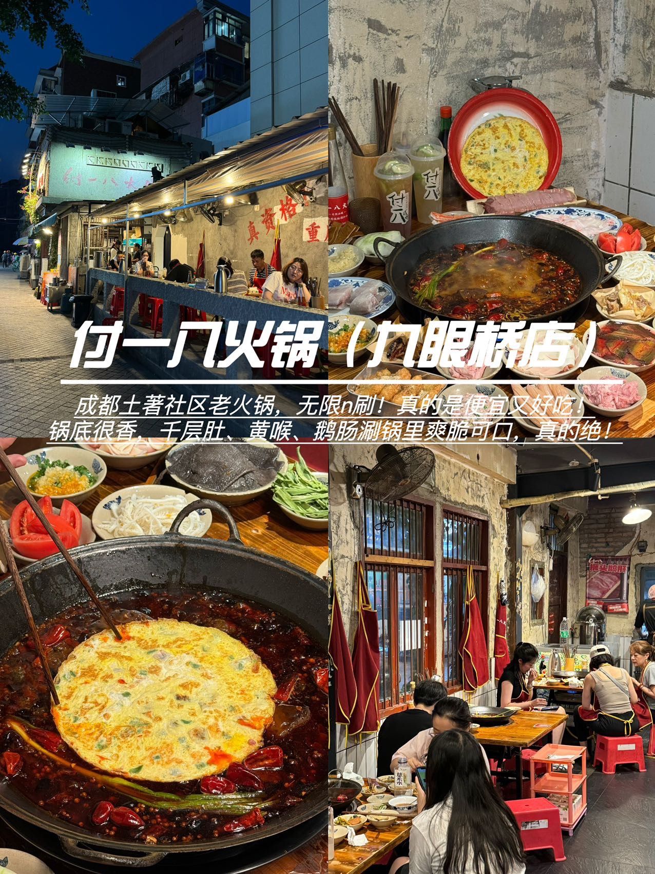付一八火锅(九眼桥店):成都土著社区老火锅,无限n刷!真的是便宜又好吃!锅底很香,千层肚、黄喉、鹅肠涮锅里爽脆可口,真的绝!
