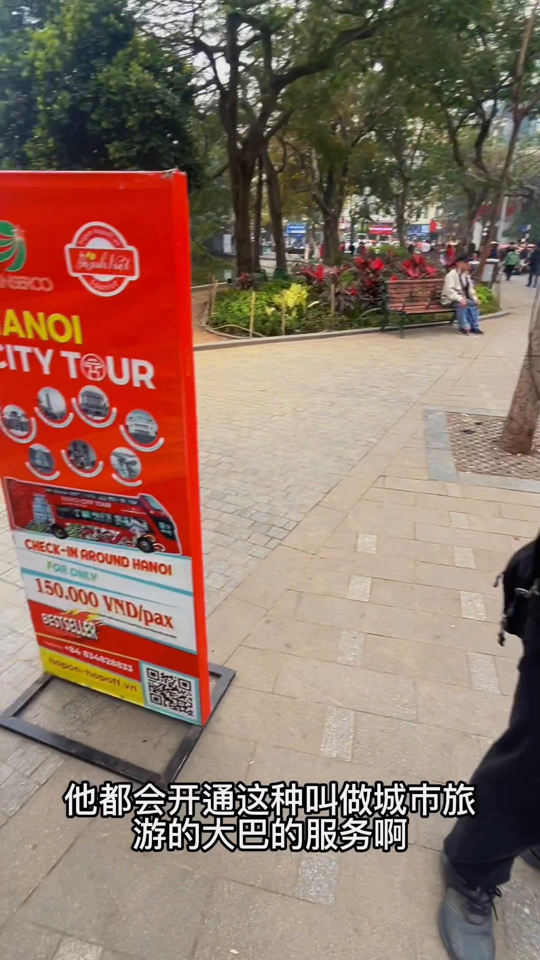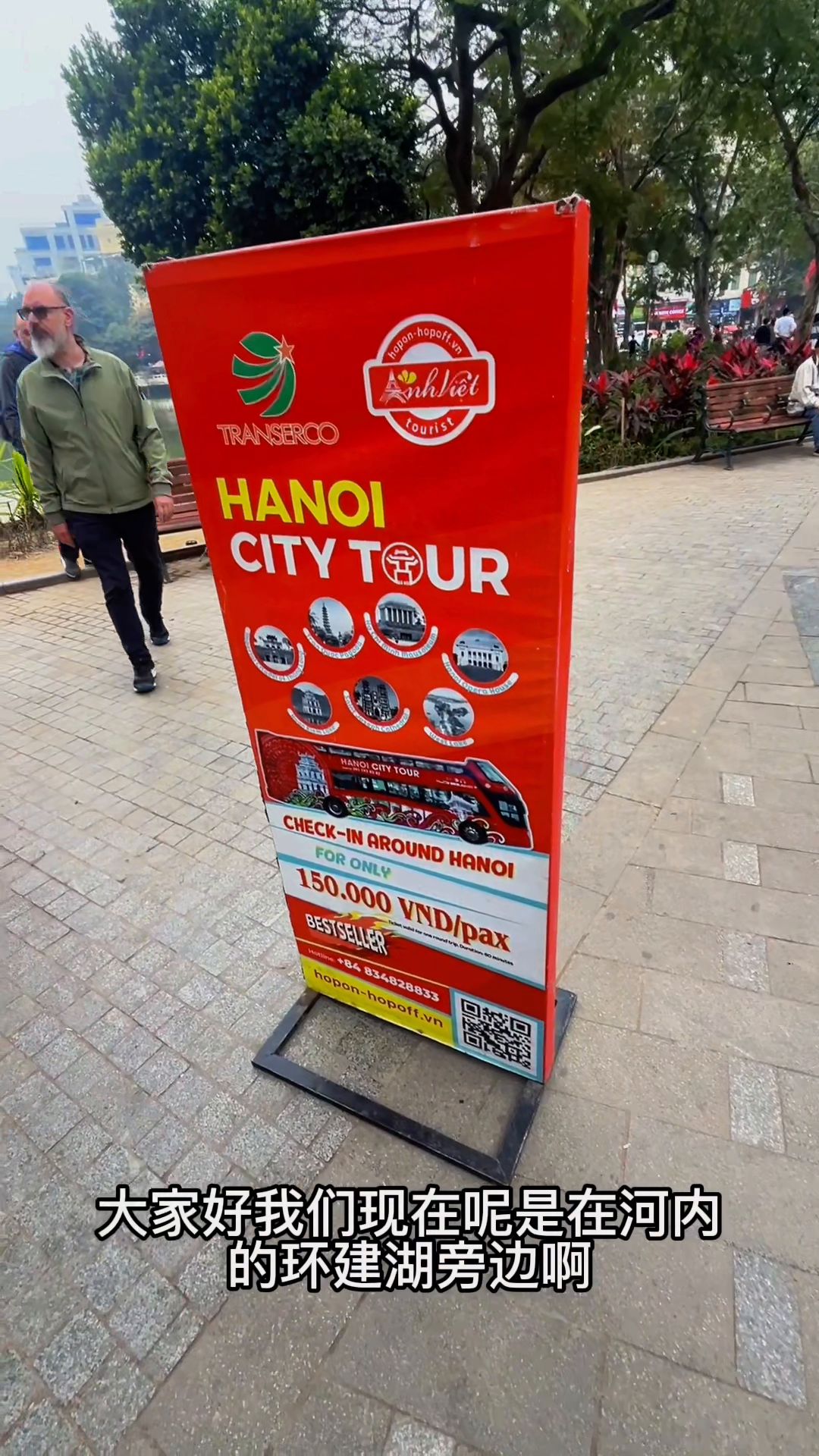 大家好,现在是在河内的环建湖旁边,在这里有一个河内城市旅游的大巴的候车点,这种红颜色的大巴在全世界好多城市都看到过,好像它是一个连锁的公司来运营的,也就是在全世界各个著名的旅游城市都会开通这种叫做城市旅游的大巴的服务。