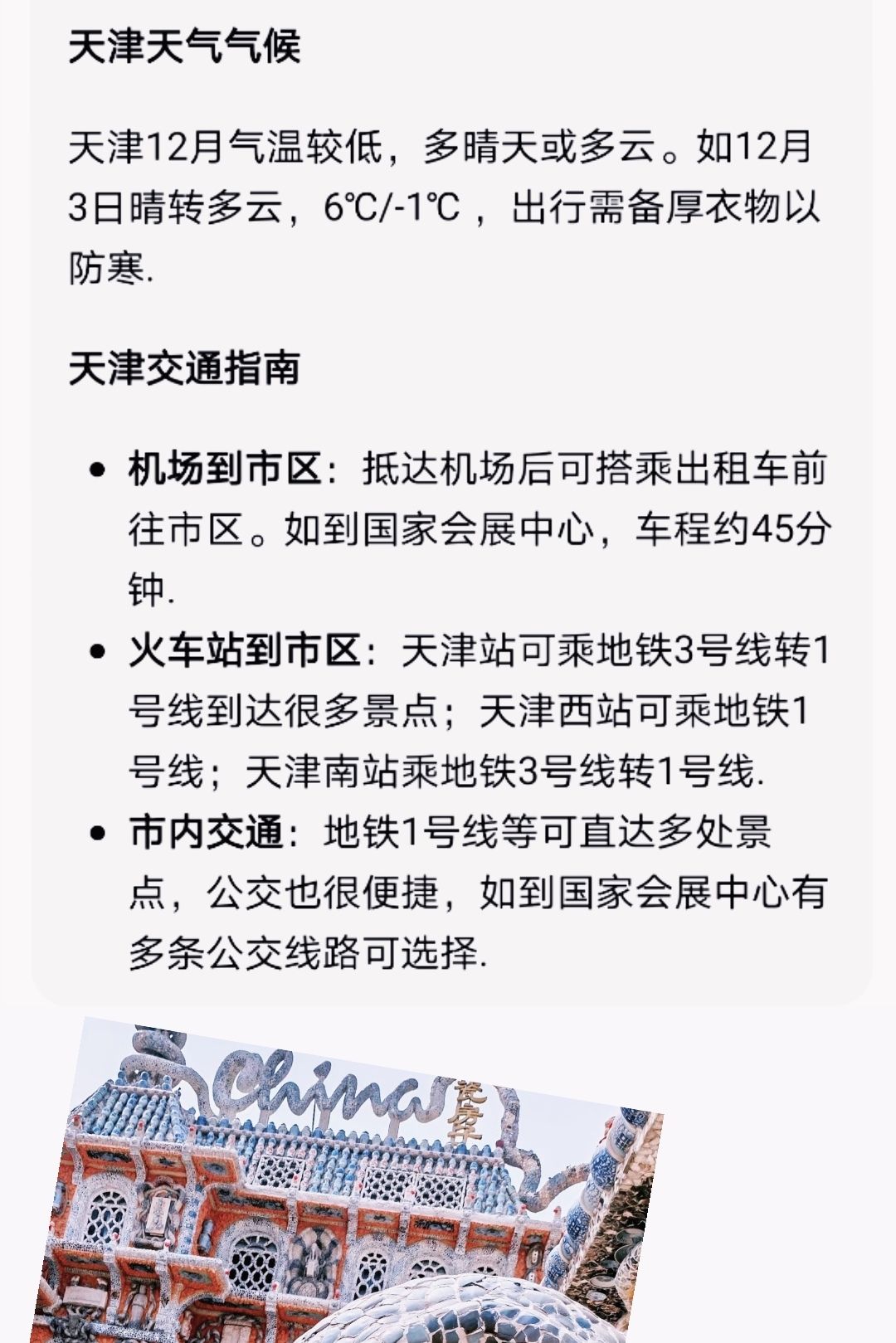 温度&天气:天津四季分明,春秋温和宜人,适合漫步街头,感受城市魅力;夏季较热,注意防晒降温;冬季寒冷,务必保暖。出行前查看天气预报,备好合适衣物。