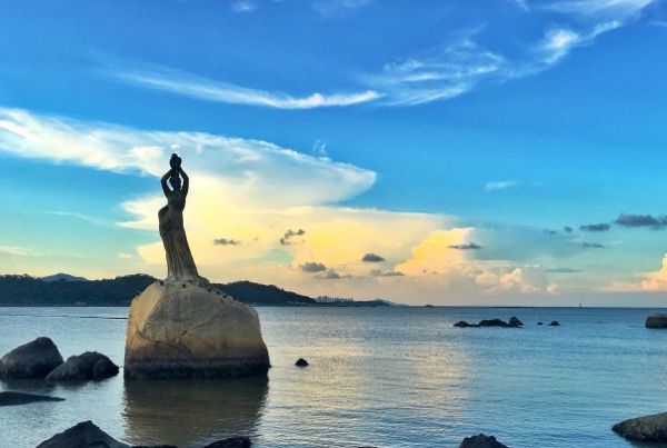 珠海渔女雕像矗立在珠海风景秀丽的香炉湾畔,是珠海的标志性景观。中国著名雕塑家潘鹤便是根据南海渔民的美丽传说设计了这座石雕。一般来珠海的游客都会特意过来拍照留念。她领戴珍珠,身披渔网,双手高擎着一颗浑圆硕大的珍珠状宝物,令人怜爱的神情栩栩如生。