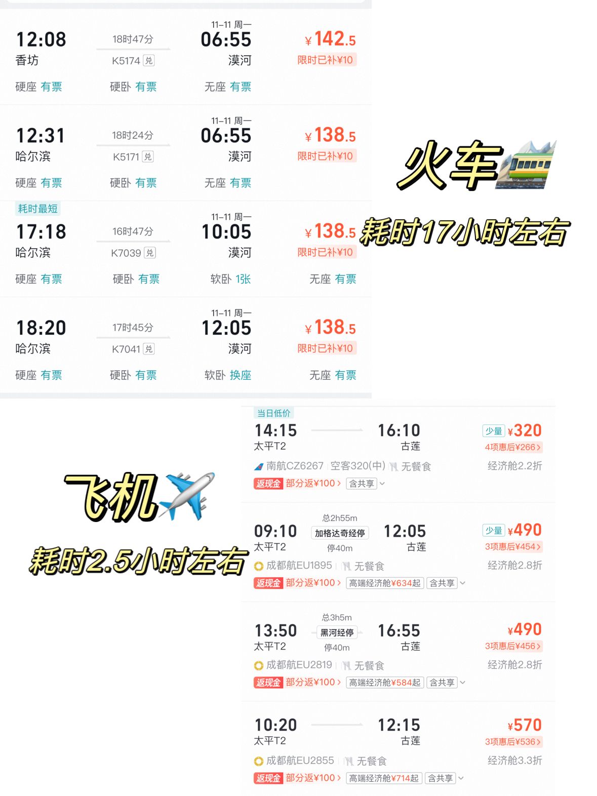 大交通,飞机和火车两种选择,都需要在哈尔滨中转