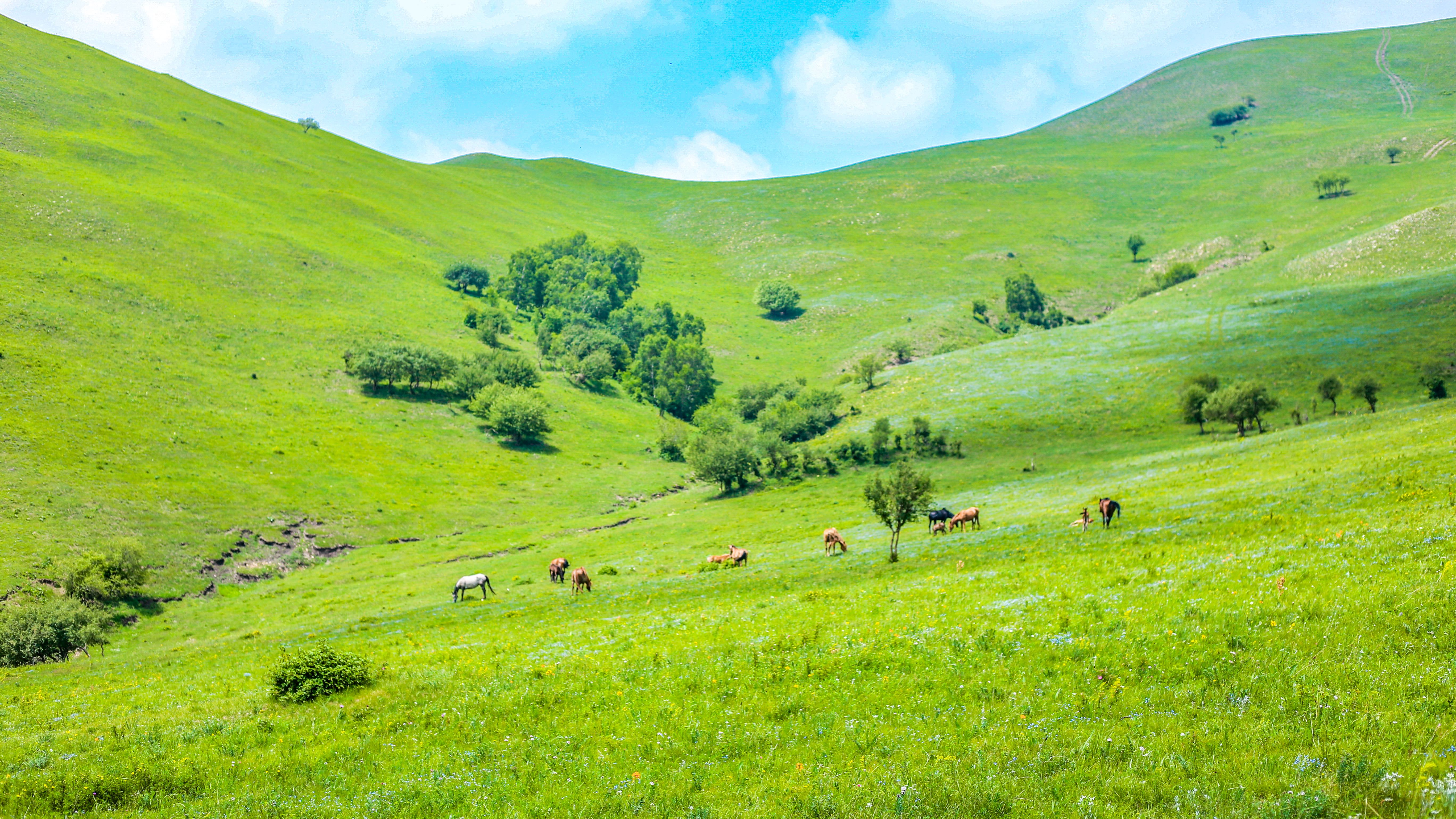 第二天租一个吉普车,可以直接联系农家乐,900块包车,3小时草原深度游,会带着前往草原深处,白桦林(图14)、牛羊马群(图11、12、13)等等,一路的风景真的很美。运气好的话,甚至能看到骆驼(图4)。