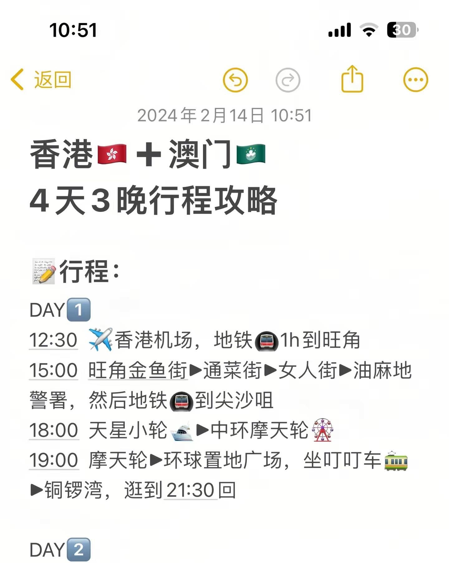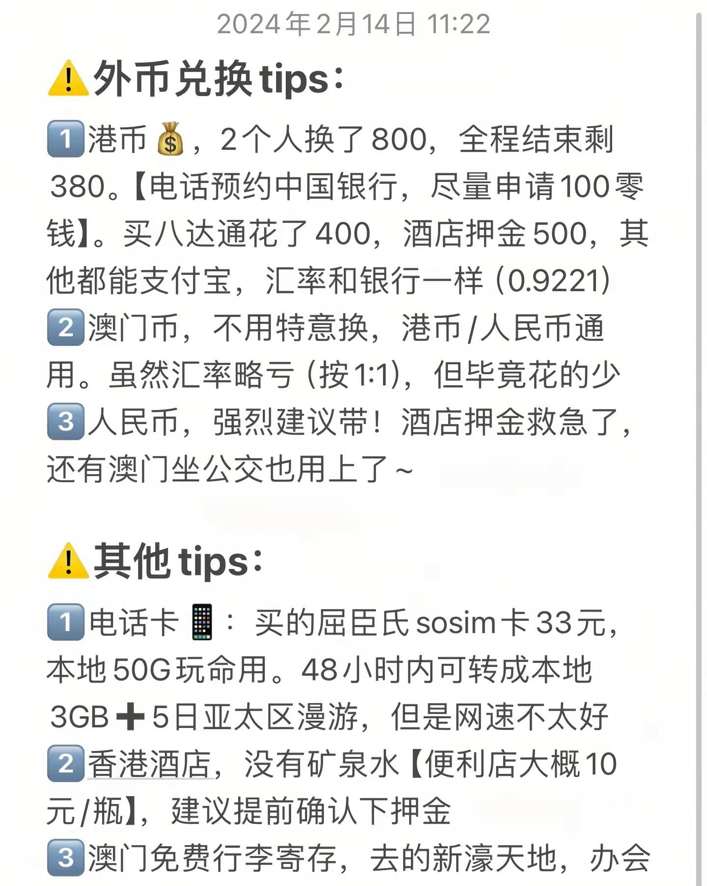 港澳4天3晚,超详细行程攻略!。大家好呀!我刚从香港澳门旅游回来,迫不及待地想要和大家分享我的新鲜经验。行程及时长、打卡景点、交通、外币、电话卡,一应俱全~-但是还是有些小遗憾的:香港太平山顶:我错过了登临太平山顶,那里的视野据说极为壮观,能一览香港全景。同时,我也没有体验到坐缆车的乐趣,这是游览太平山顶的标配。迪士尼和海洋公园:面对选择题,我只选了其中一个。每个公园都有它独特的魅力,一个是梦幻的童话世界,一个是充满冒险与探索的乐园。购物时光:香港作为购物天堂,铜锣湾和海港城等地我却没能好好逛一逛,错过了淘好货的机会。美食探索:香港美食世界闻名,但此行我对于美食的探索并不充分,许多网上大热的美食打卡点都没有去成。- 下次旅行建议规划充足的时间:旅行计划中,留出足够的时间来探索每一处想去的地方,尽量避免走马观花。做好准备:提前了解目的地的景点特色和必玩、必吃清单,做到心中有数。灵活调整:即使是最周密的计划也有可能受到各种因素的影响,保持一份灵活性,随遇而安也是旅行的一部分。留有余地:每次旅行不必强求一次完成所有打卡,遗留下来的,未尝不是下一次旅行的理由。 #澳门 #香港旅游攻略 #香港旅游 #澳门旅游 #港澳