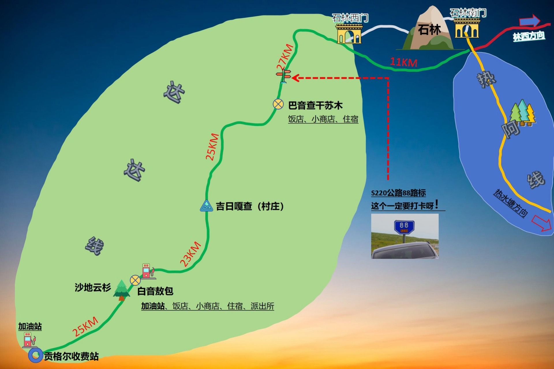 达达线南边入口:贡格尔收费站,北边入口:阿斯哈图石林西门。中间全程130公里左右,加油站一共有两个,贡格尔入口一个,白音敖包小镇一个,白音敖包的开不开不确定,所以入口加满是必须的!如果从热水塘走热阿线进入,建议在热水塘加满油。