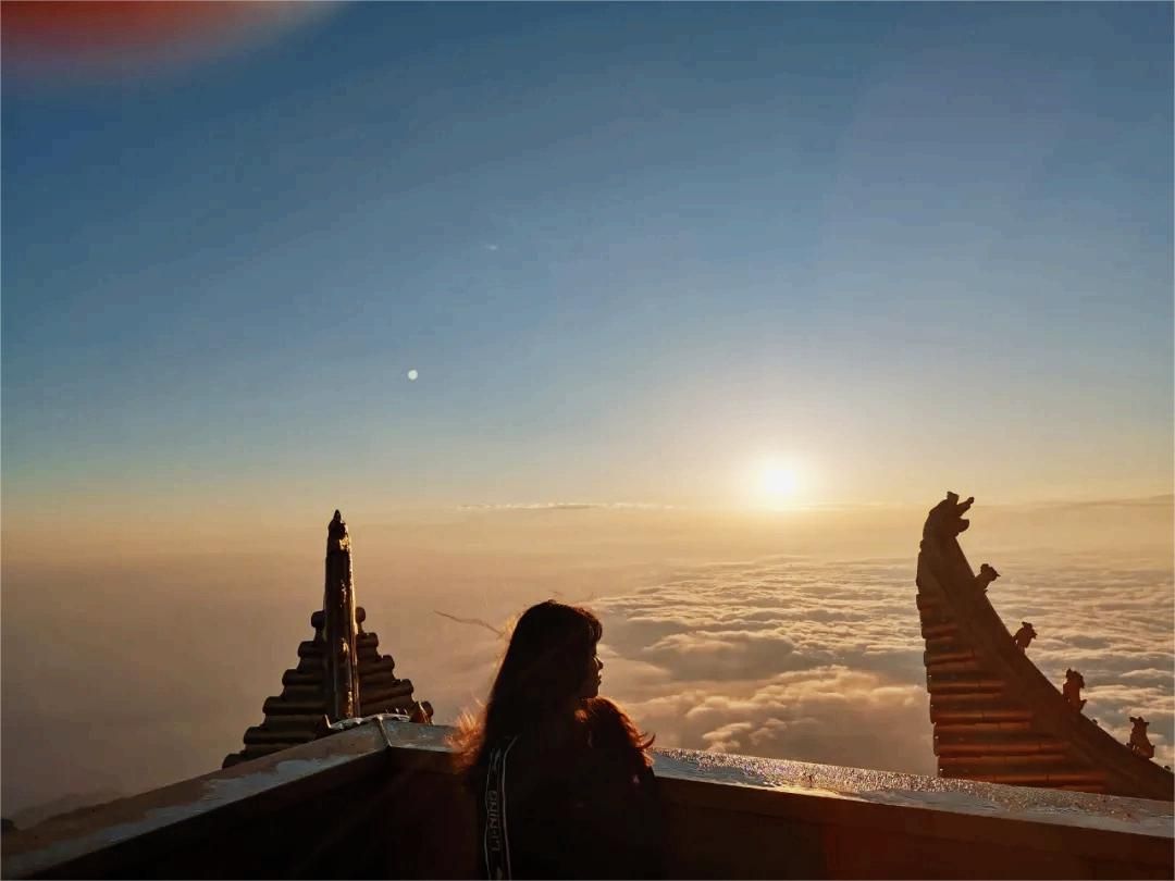 4、7:40到达【金顶】,随后观云海、守候佛光、朝拜四面十方普贤、近赏万佛顶、远眺贡嘎雪山、瓦屋山、成都平原,在金顶浏览3个小时20分钟,包含吃早饭30分钟;