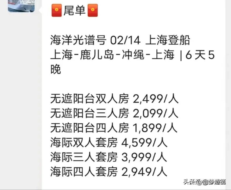 邮轮,上海出发,大多奔着日韩。为啥?近啊,四五天假期,够来个短途溜达。至于尾单,没啥稀奇的,就是清仓甩卖,房间卖不出去,着急回本嘛。