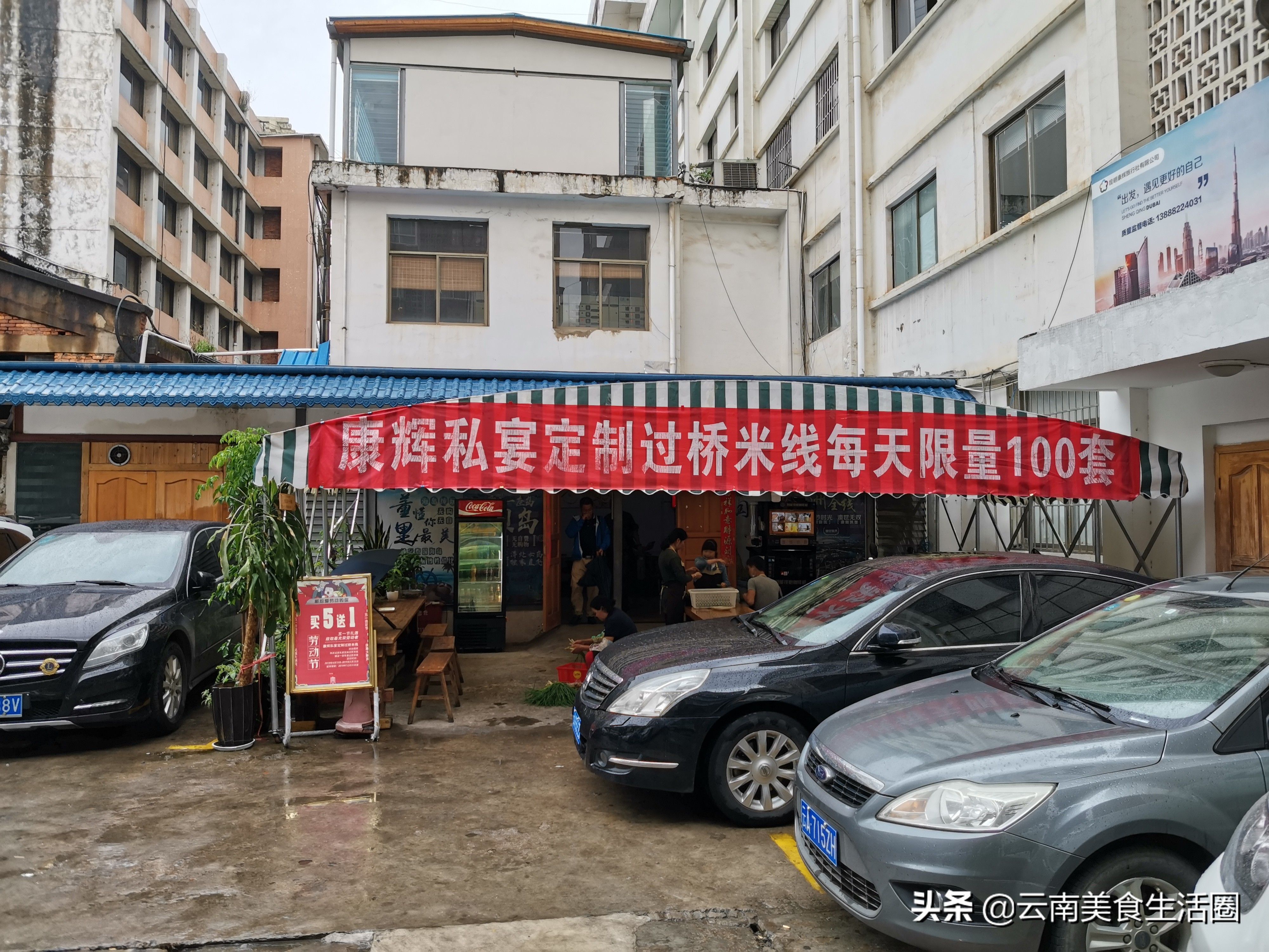 小店外面没有店名,雨棚上写着“康辉私宴定制过桥米线每天限量100套”。哦,原来这是康辉旅行社的内部食堂(之一)。