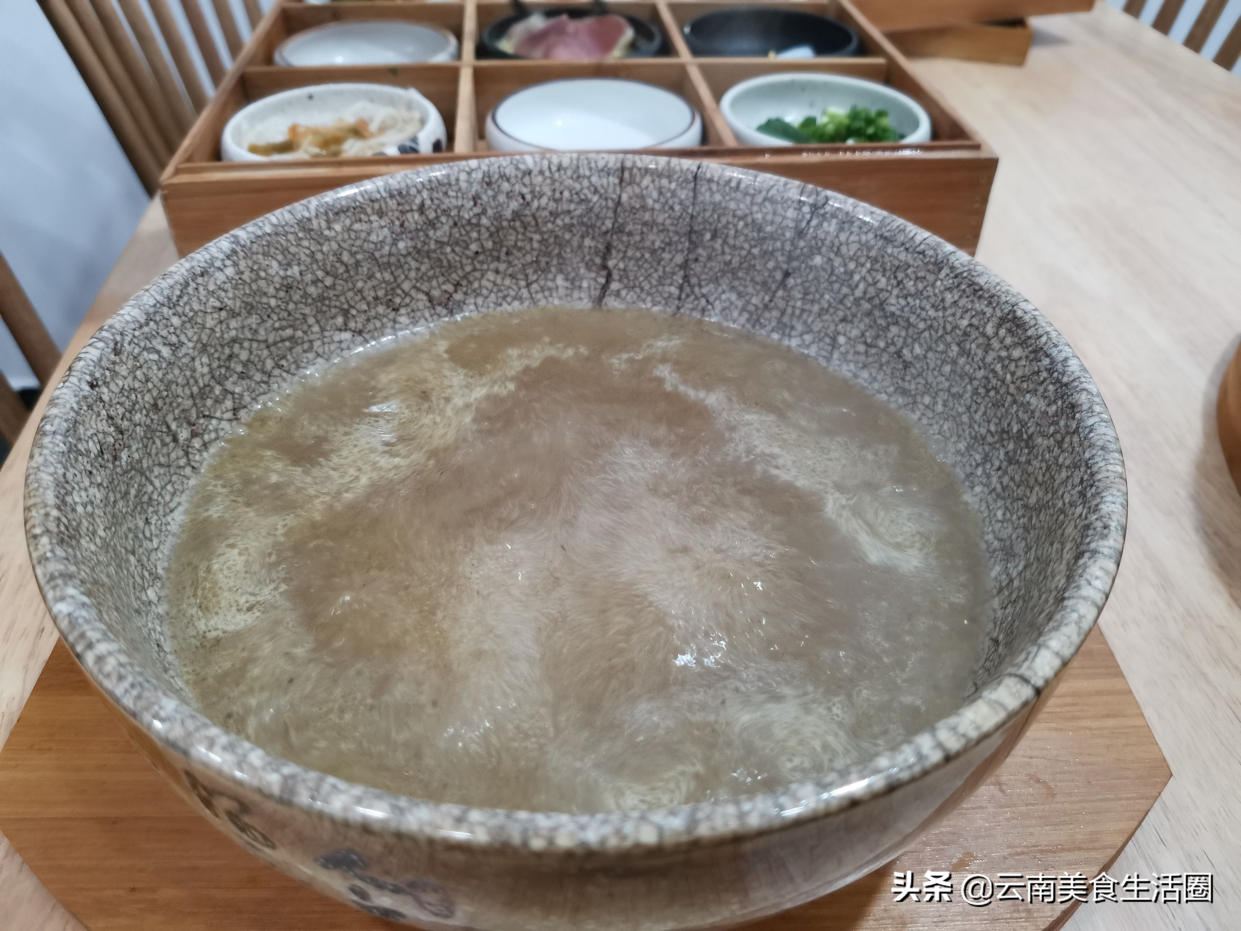 朋友根本不想让我宣传,因为这100碗经常不够他们员工和旅行社的客人食用。我说这是我在昆明目前发现的做法最地道、味道最好的过桥米线,如果不让我分享怎么可以!如果想去吃的朋友可以关注我(请一定先关注,因为你的关注对我很重要,谢谢!)以后留言,我会偷偷的告诉你地址。