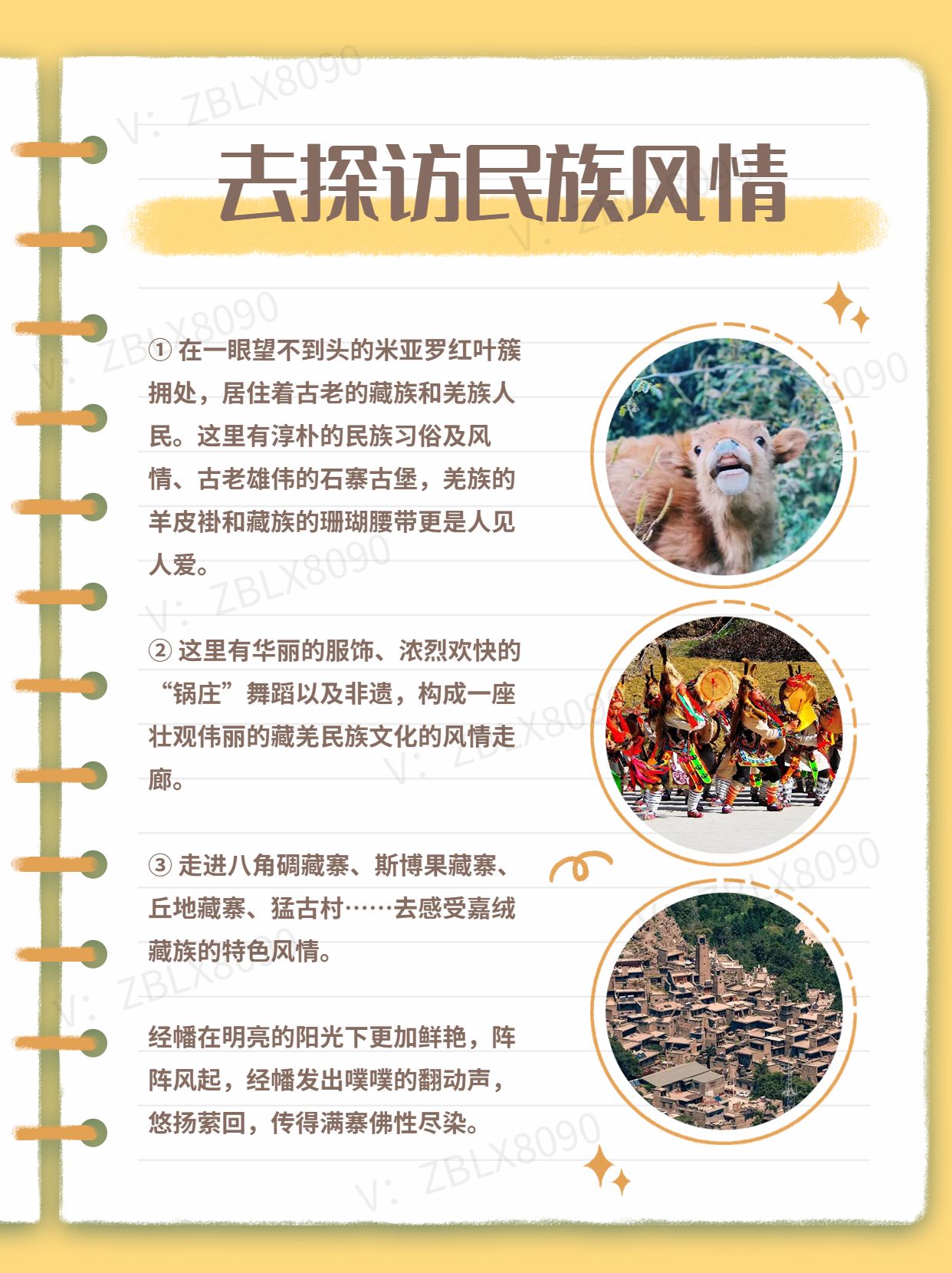 在一眼望不到头的米亚罗红叶簇拥处,居住着古老的藏族和羌族人民。这里有淳朴的民族习俗及风情、古老雄伟的石寨古堡,羌族的羊皮褂和藏族的珊瑚腰带更是人见人爱。