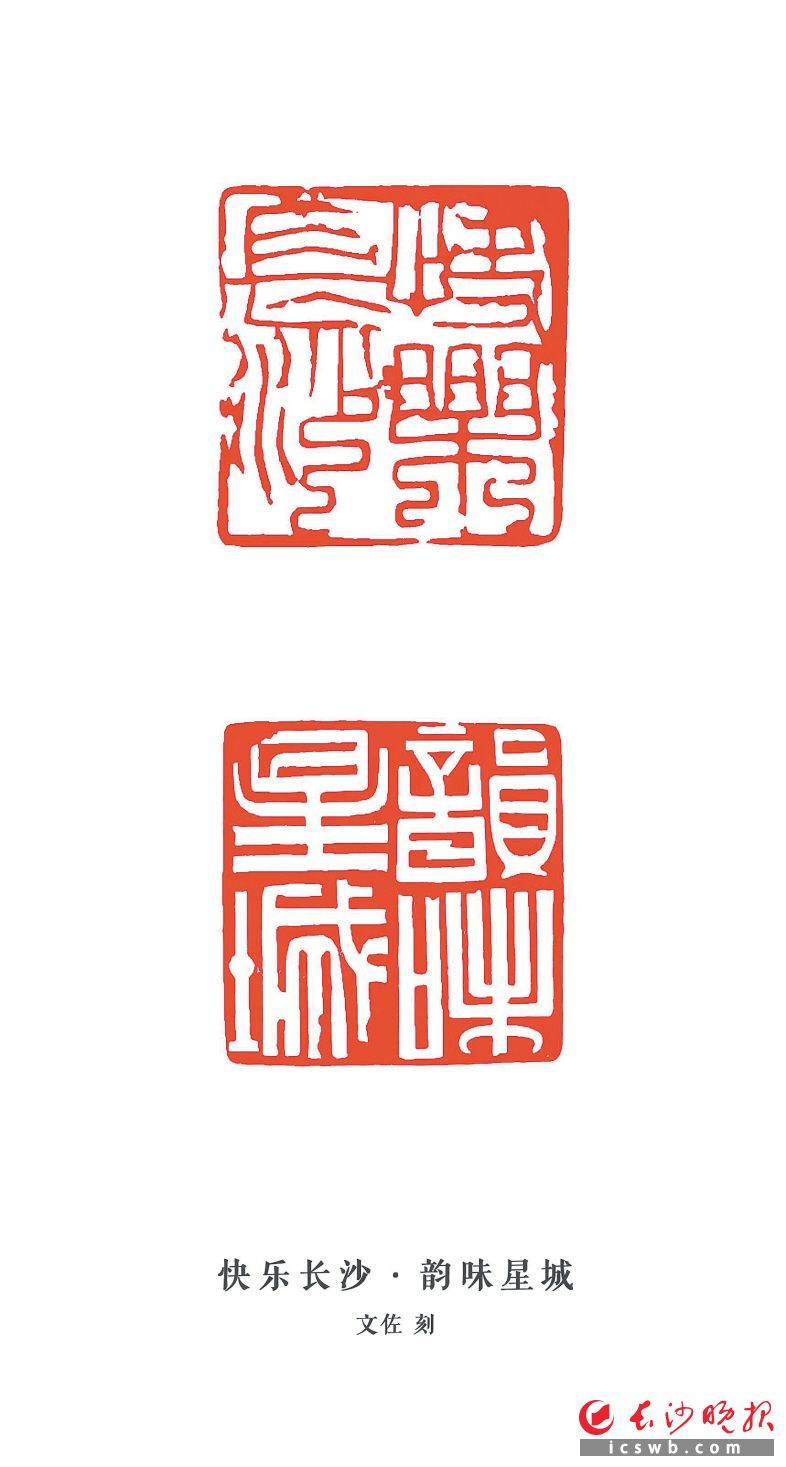 21日,青年书法篆刻家、湖南第一师范学院教师文佐第一时间凑刀刻治了“快乐长沙 韵味星城”一对印章,用金石书法艺术表达对长沙的热爱。两方印的边款也十分有趣,分别为:长沙是一座让人乐而忘忧、乐而忘返、乐不思归的幸福之城;长沙又名星城,不只有辣味,还可甜可咸,韵味十足。