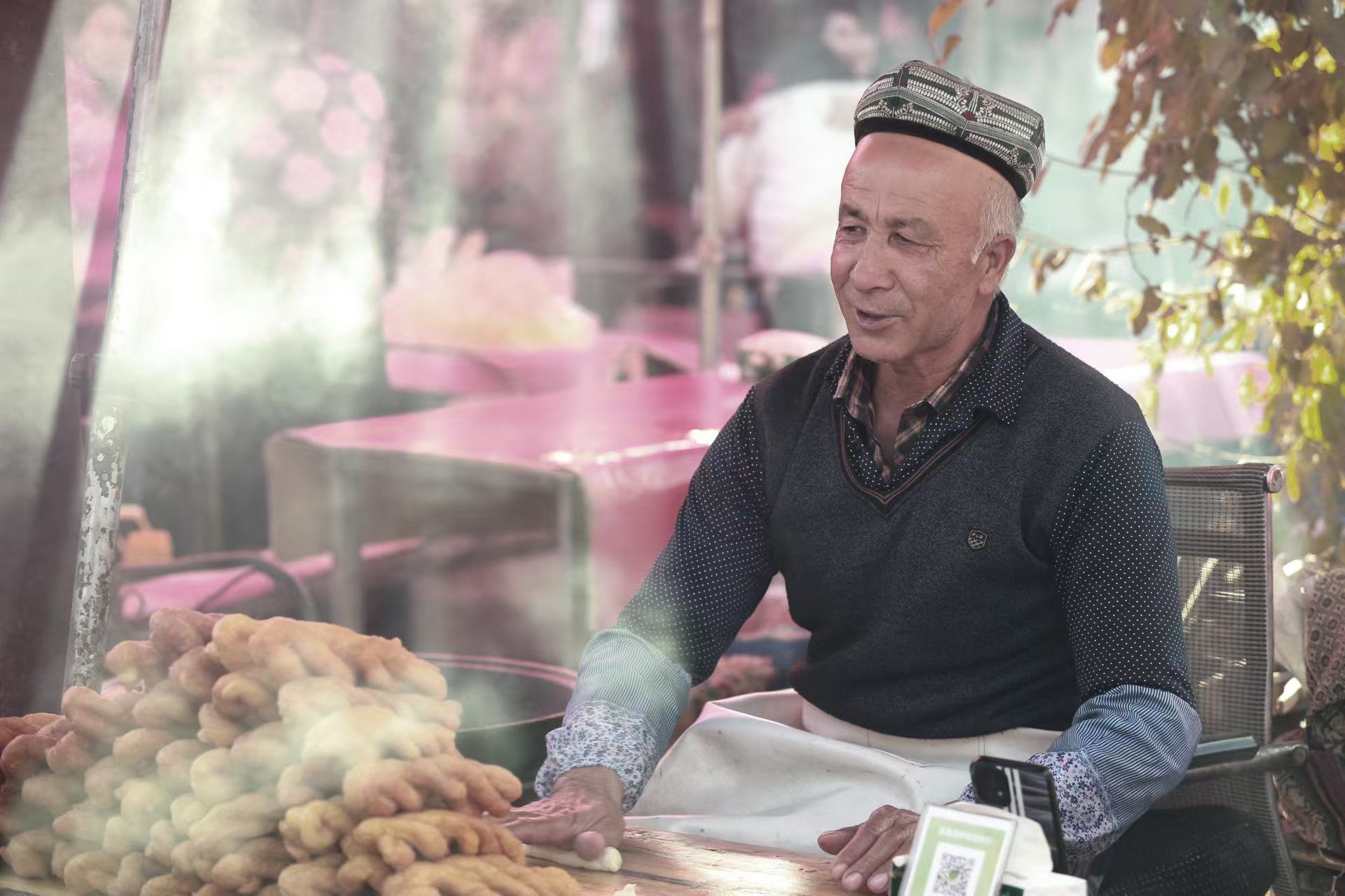 坐在切糕摊位前,一位维吾尔族大姐切下一块让我们品尝,这时直播间有人说,“千万别尝,小心被诈!”我跟大家说,“你们真的想多了,这里的老乡热情善良好客,先尝后买是他们的待客之道。”我这句话不是随意说的,而是切身体会。因为,就在刚才,我和陶总买羊肉,摊位上的长者直接给我切了一块煮熟的羊肉,让我品尝。他说:“你先尝一下咱们的羊肉,香得很!”其实,我不尝也知道这里的羊肉好吃,但长者的善意我不能回绝,还是接过来尝了一口。长者的笑容真诚而慈祥。