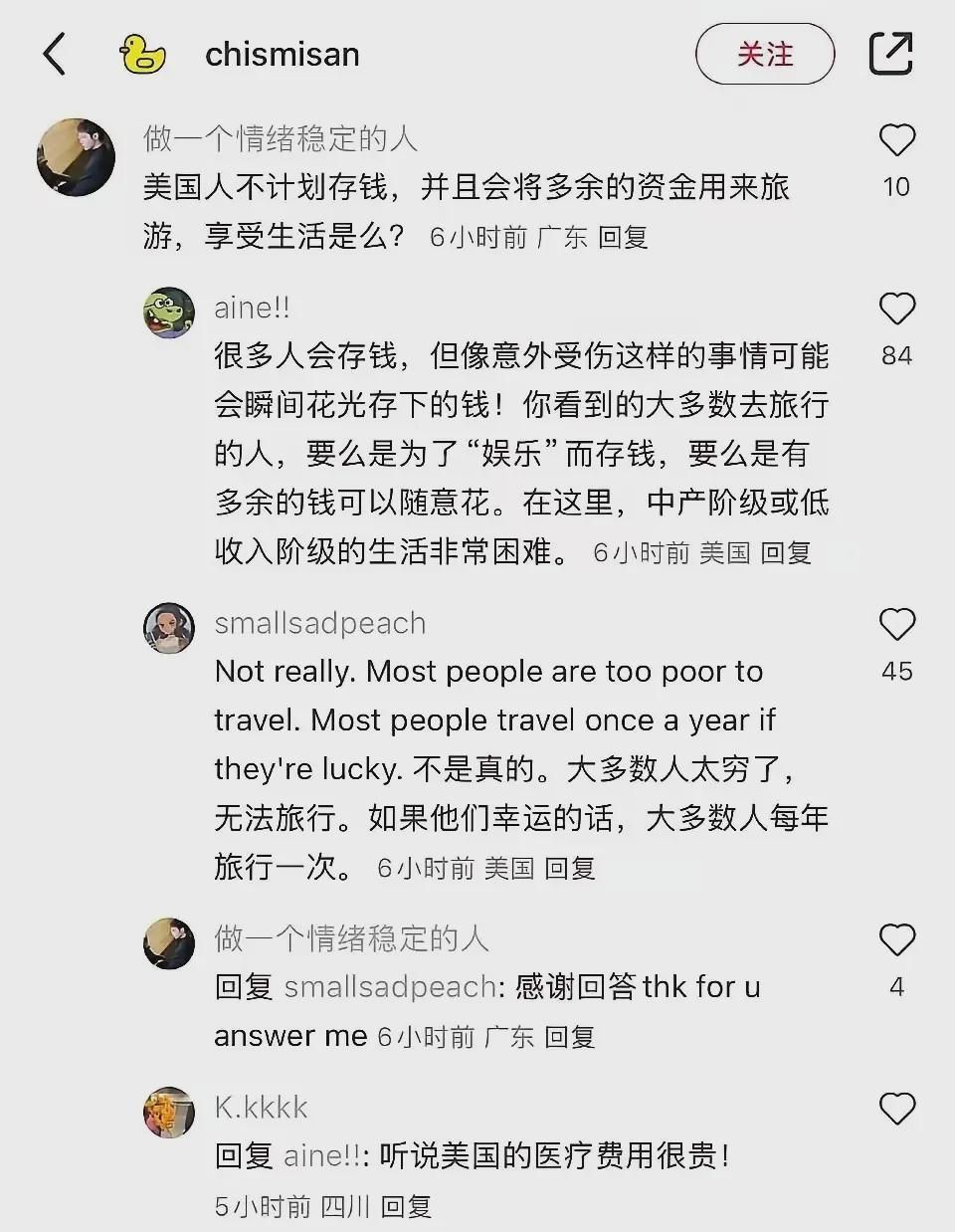 “中美网民在小红书上互诉苦衷。中国网民称自己每年仅能出游一两次,羡慕美国人的自由旅行。而美国网民反驳称,多数人无力出游,生育、看牙费用高昂,且每月需支付高额保险费。双方均表达了各自国家生活的不易。看了三天小红书,三观炸裂!大家自己过去看!不是少数美国人这么说,是大多数!有视频有评论! ”