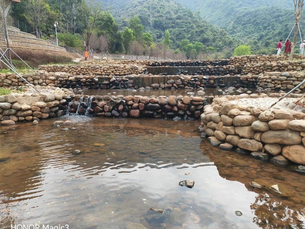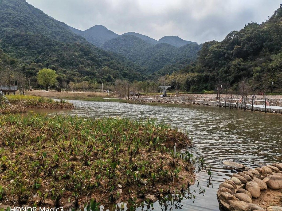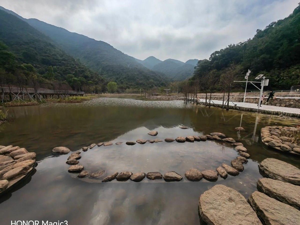 一进门就看到田头山,绿油油的,像个巨大的绿色蛋糕。听说这是深圳第七高峰,海拔689米,不过山势很缓,爬起来应该不费劲。公园沿着山谷里的河道建的,依山傍水,景色真不错。 河道里都是圆滚滚的鹅卵石,还有用石头垒起来的鱼鳞池,水哗哗地流,像一条条小瀑布。 再往上走,有个小湖,水很清澈,阳光照在上面闪闪发光。