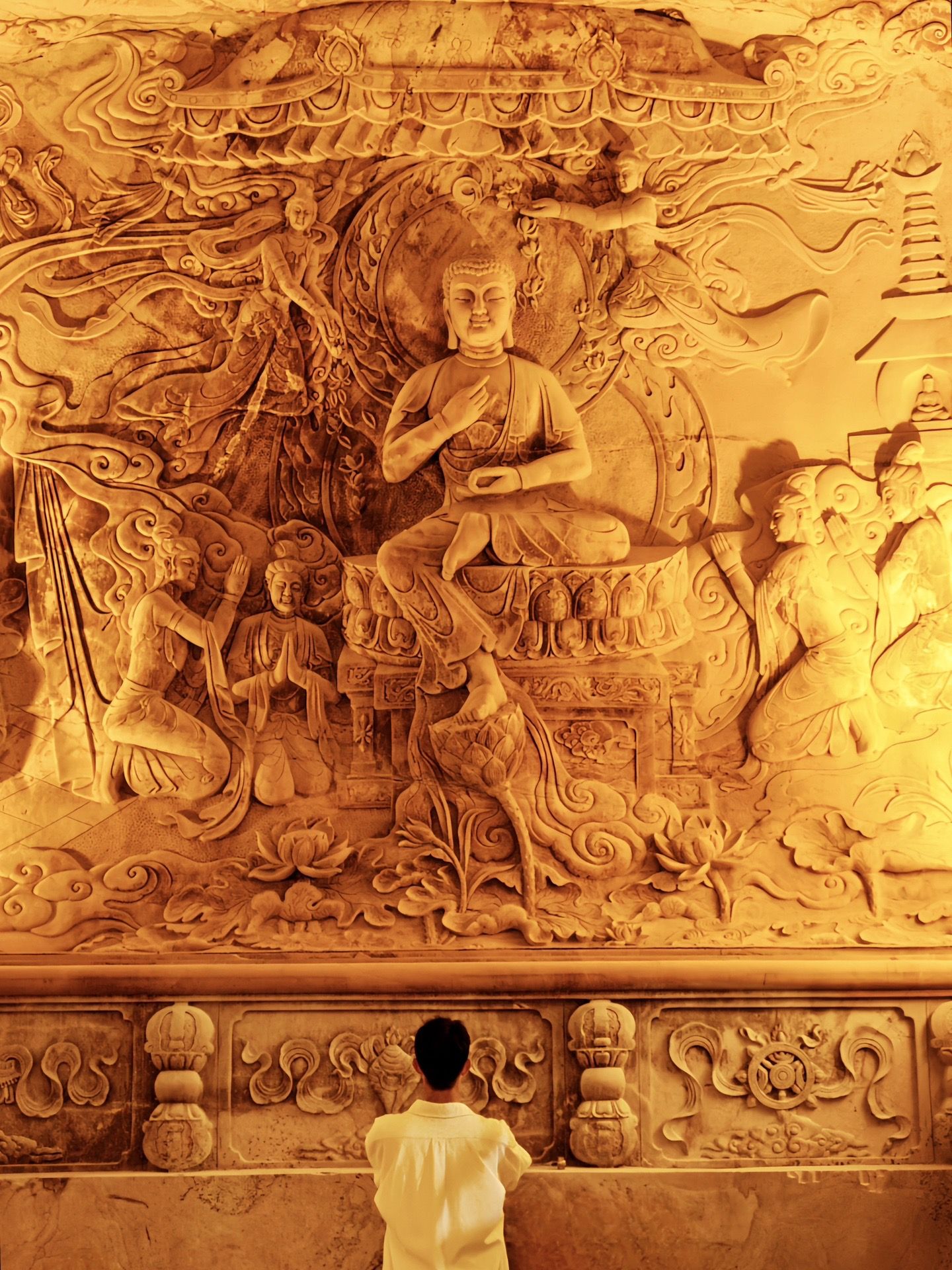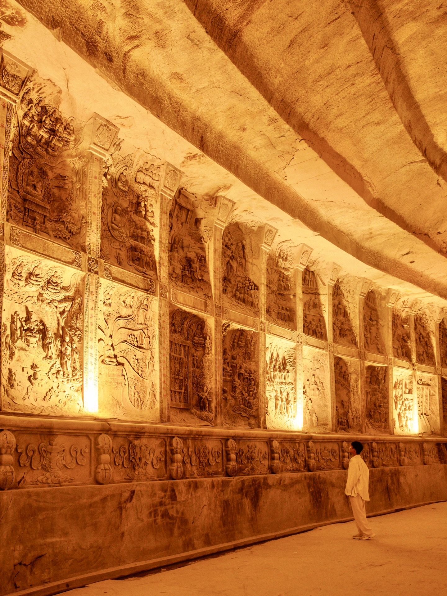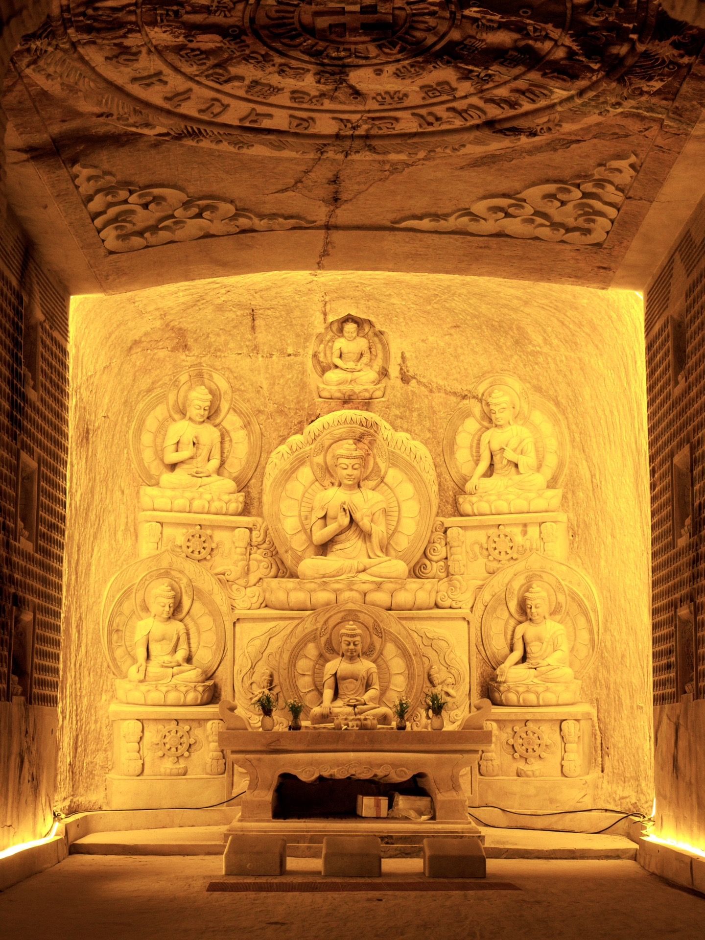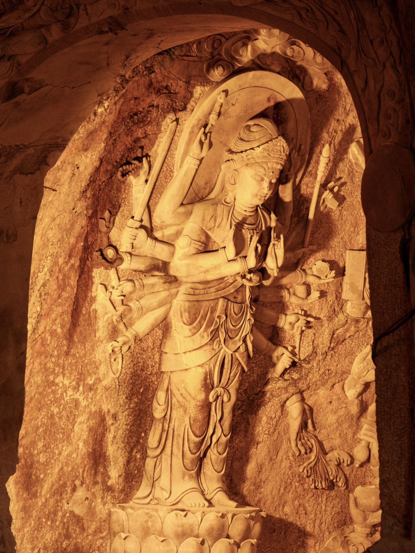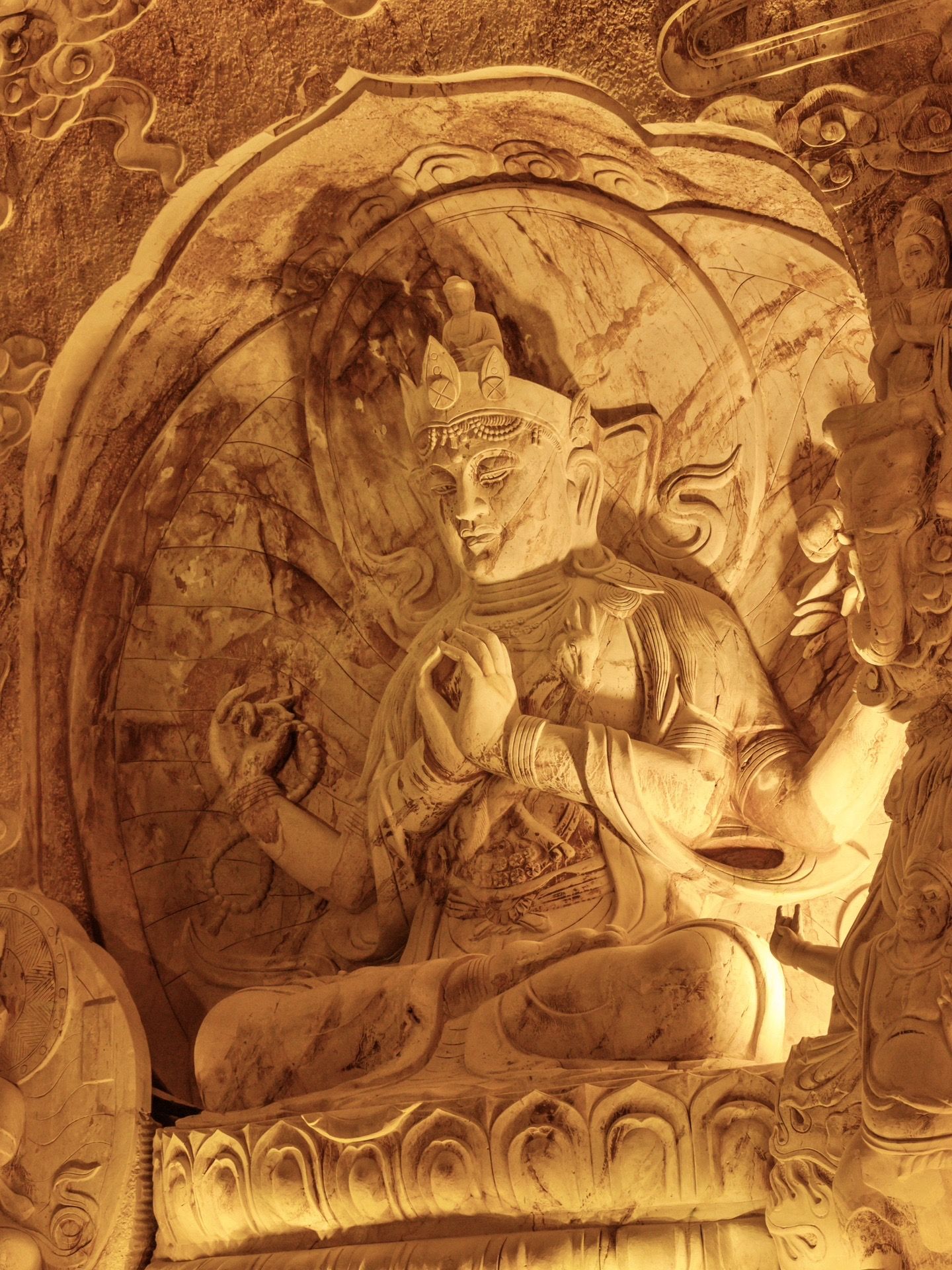 石窟内部昏暗,好在内部有灯光,佛像更具神圣感。洞窟内的四面佛等等,拍起来很震撼