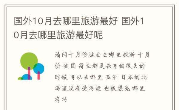 综上所述,十月份国外旅游的最佳去处包括法国、荷兰、日本、新加坡圣淘沙、尼泊尔、土耳其和泰国等地。这些地方各具特色,无论是自然风光还是人文景观都值得一游。