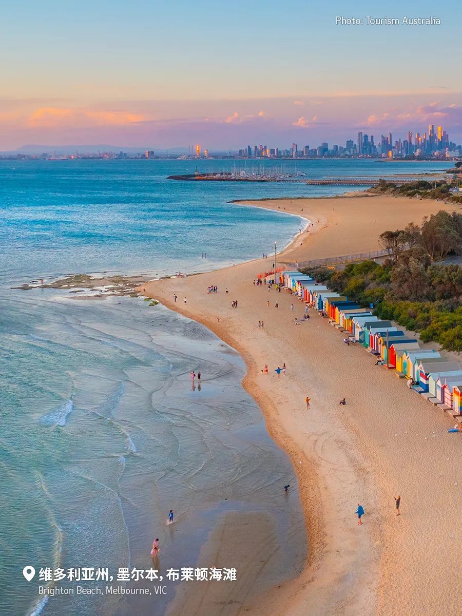 沙滩上排列着五彩斑斓的小屋,充满了浓浓的童话气息。城市天际线在夕阳的映衬下显得格外温柔,如同一幅流动的莫奈画卷。