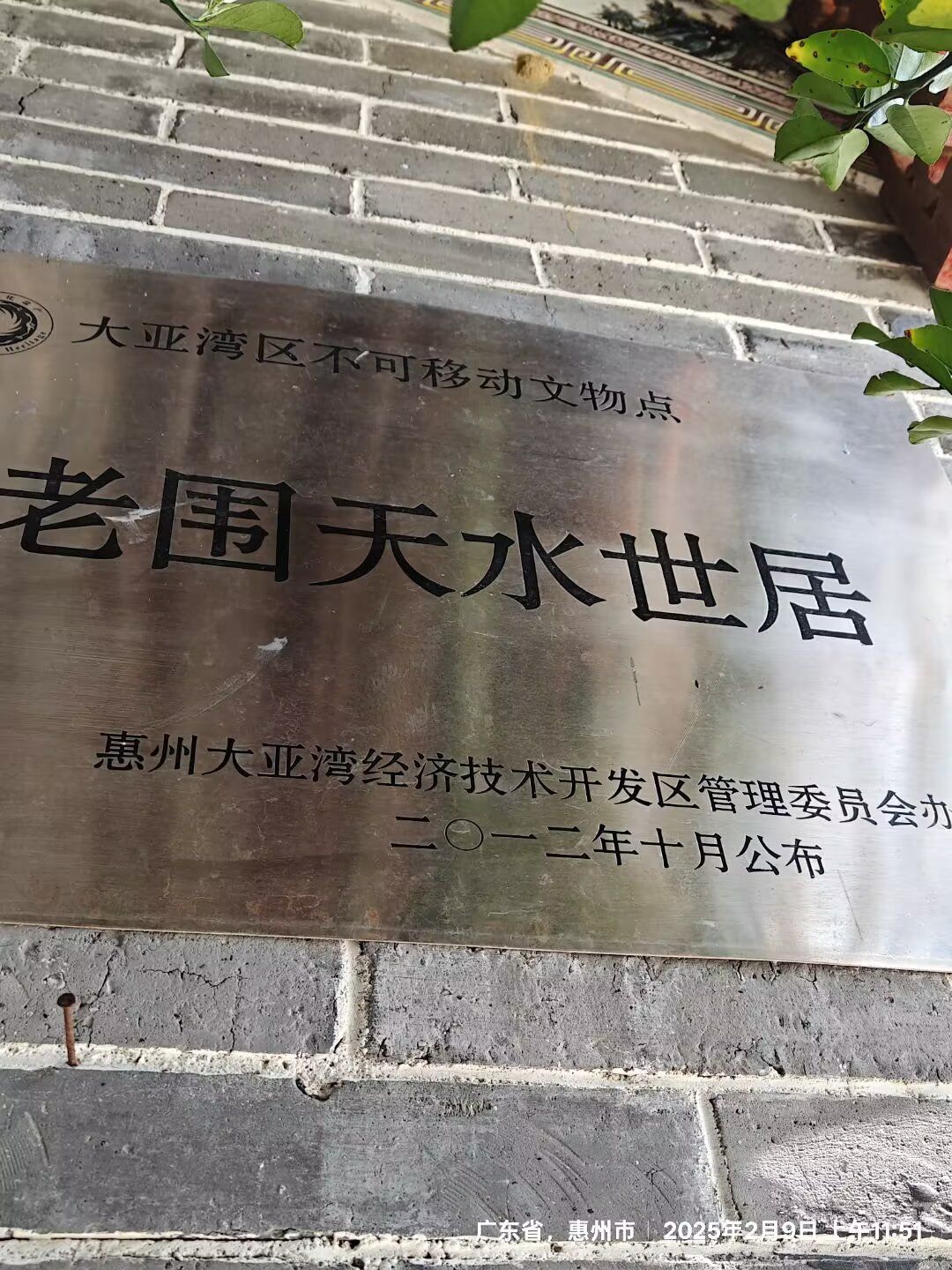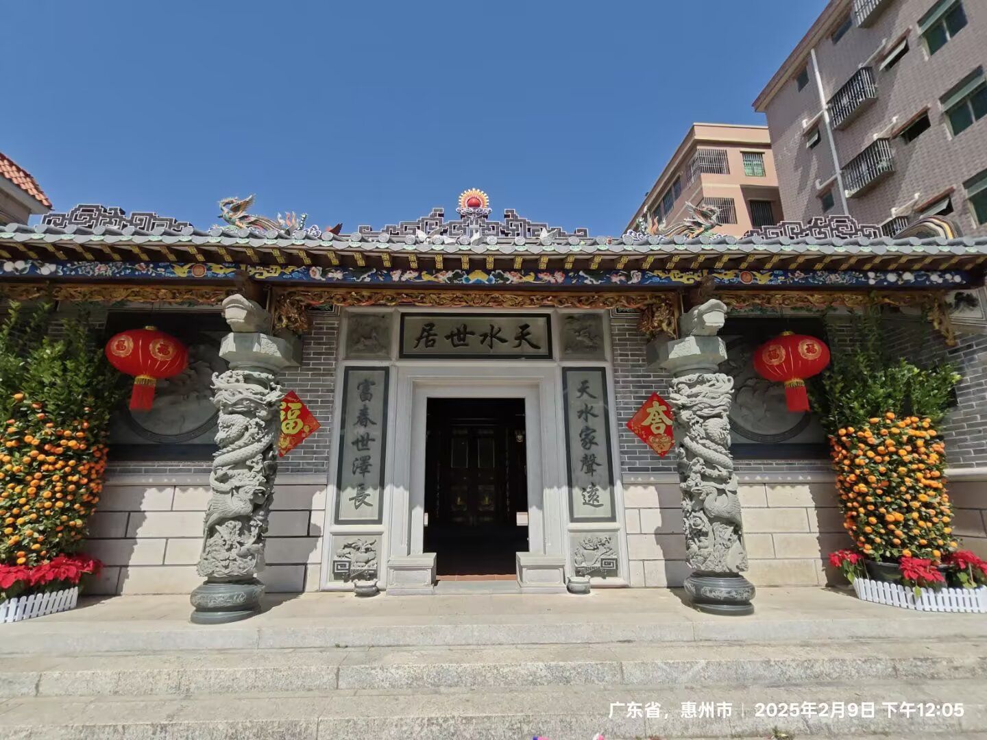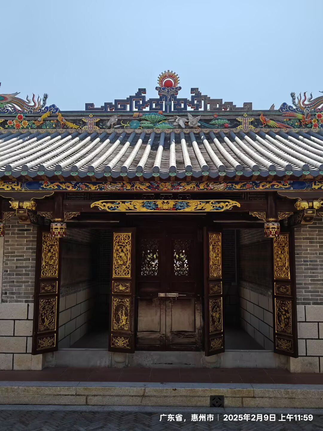 #惠州 #惠州大亚湾 2025年2月4日在寻访大元背望楼时曾到过该宗祠,以为是新建的并未引起重视,当时感觉富丽堂皇,精雕细琢,高档大气。回海景城后查阅资料知道了系27处不可移动文物之老围天水世居,2月9日为进一步考证,再次访寻。据相关史料记载,推算祖辈维翰公约在明朝中期定居于樟树浦村。历五世后,于清初期始建严氏祠堂。据老者相传,当时樟树浦共有严、陈、炎、孙、叶、包、吴七姓人居本村,自严氏祠堂建成后,其他各姓皆相继迁出,形成了惟严氏族人居住的村场。另据门楼牌匾记载,老围村原有三个门楼的围屋,建于乾隆四十年乙未岁。1983年由港澳宗亲自资进行过修缮,时光荏苒,风雨侵蚀,祠堂呈现倒塌之隐忧。