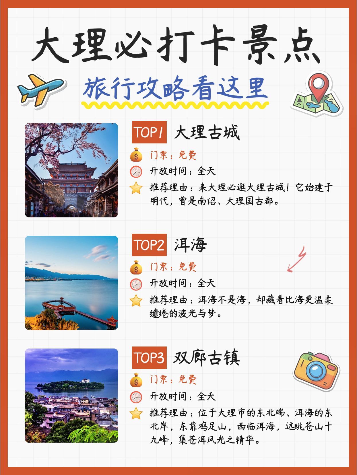 1. 大理古城:位于云南省西部,又名叶榆城、紫城。在唐、宋500多年间是云南经济、文化交汇地,古城内文物古迹和城池格局基本保存,可体验当地特色美食,感受白族风土人情。