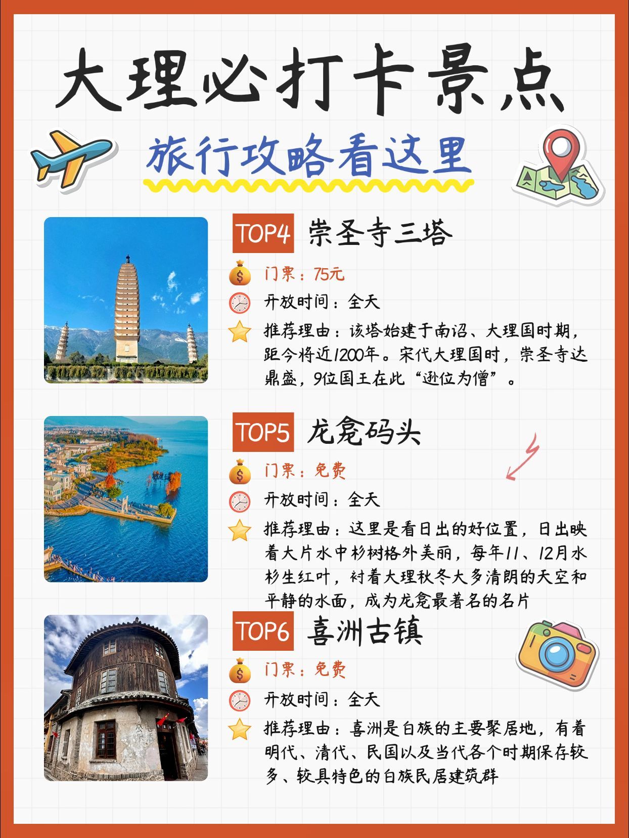 7. 崇圣寺三塔:大理国时期皇家寺院,大理标志性景点,寺院规模宏大。三塔矗立在苍山脚下,远远望去十分壮丽,近距离观赏令人心生敬畏。