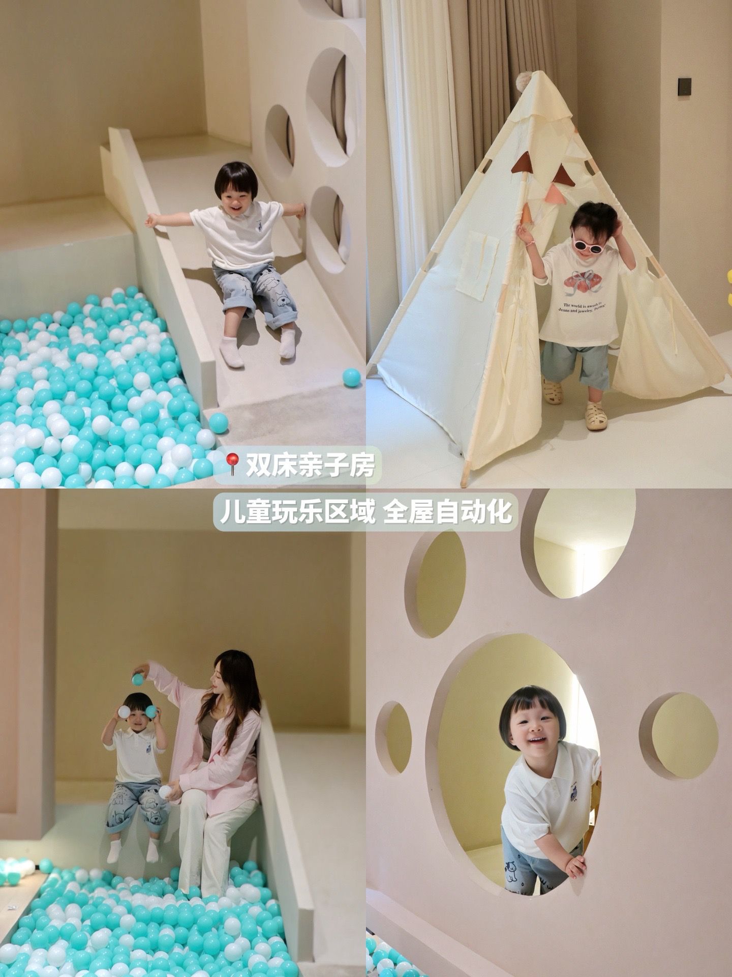 亲子旅行的重点就是回民宿能解放双手,这次选的亲子房有小帐篷,滑滑梯,泡泡池一系列宝宝可以玩的配置,一回房间Yi崽就能自嗨到直接倒床就睡。