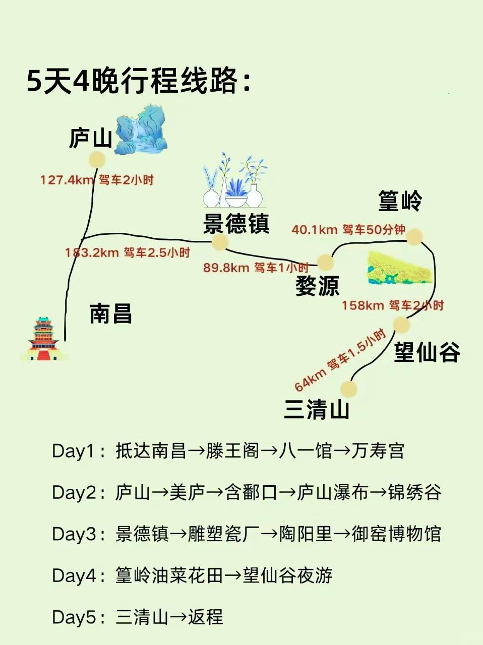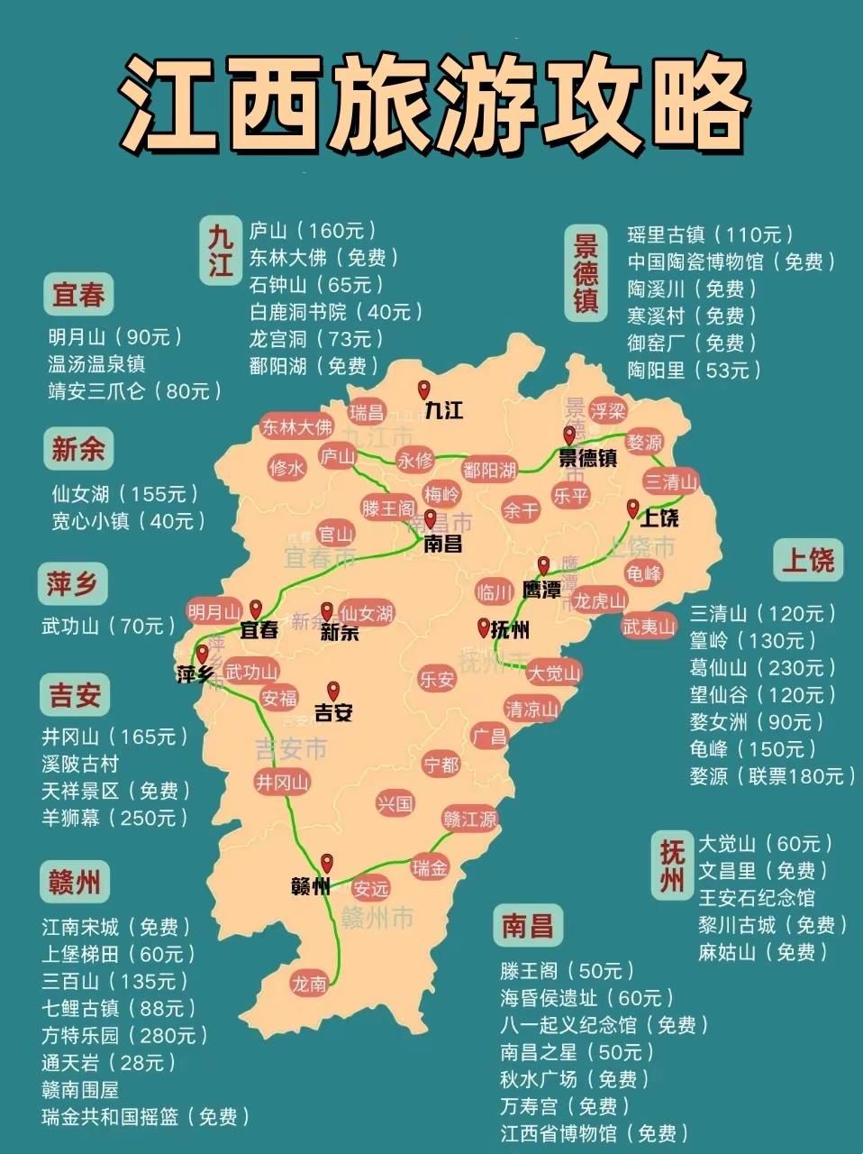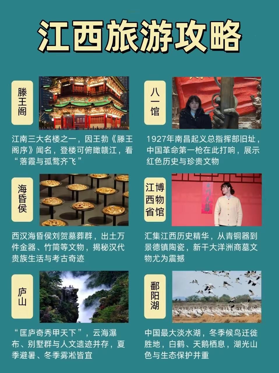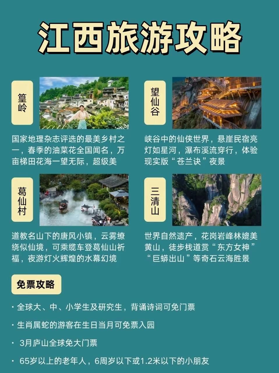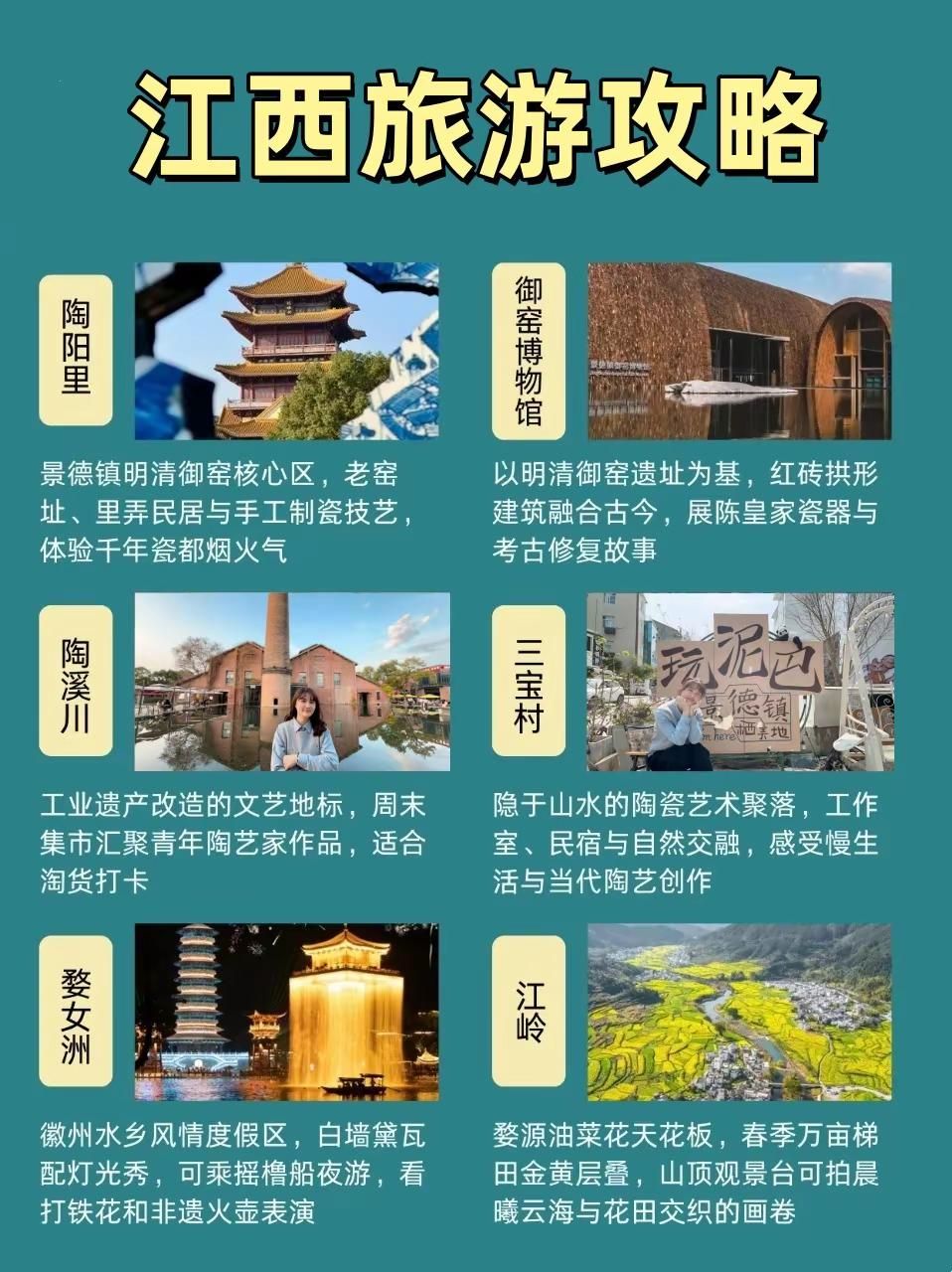 江西旅游路线全攻略。“物华天宝,人杰地灵”的江西,远比课本更惊艳!攻略在手,说走就走奔赴这场诗画山河吧! 行程规划3天2晚速游版Day1:景德镇雕塑瓷厂淘手作瓷器陶阳里探秘老窑遗址御窑博物馆拍红砖大片Day2:篁岭望仙谷万亩油菜花梯田+晒秋人家夜游悬崖仙侠世界,提灯漫步星河Day3:三清山返程徒步“东方女神峰”,赏云海奇石 5天4晚深度游(适合带长辈/亲子)Day1:南昌滕王阁背《序》免票八一馆红色研学万寿宫夜市吃拌粉瓦罐汤Day2-3:庐山含鄱口看日出三叠泉瀑布美庐别墅下午茶夜宿牯岭街Day4:婺源景德镇江岭油菜花海航拍陶溪川逛周末集市亲手捏陶体验Day5:望仙谷返程穿汉服打卡水幕幻境,拍武侠感大片 必打卡神仙地标 望仙谷夜游堪比《苍兰诀》!悬崖民宿灯火如银河倾泻,非遗打铁花+瀑布栈道,仙侠感拉满!免票tip:生日月免费+背诵诗词免门票 海昏侯墓博物馆“黄金大墓”出土万件金器!马蹄金堆成山,汉代土豪生活震惊 陶溪川文创园旧瓷厂改造的文艺圣地!周五/六晚有青年艺术家集市 篁岭国家地理认证“最美乡村”!3-4月油菜花海漫山遍野,秋日晒辣椒柿子更出片 江西隐藏玩法 滕王阁背《序》免票:6分钟内背完全文 庐山免门票:65岁以上老人全年免费当月生日免票 婺女洲夜游:乘摇橹船穿越徽州水乡,打铁花+水幕秀堪比春晚! 葛仙村祈福:乘缆车登顶道观,晨钟暮鼓间看云海翻涌 防坑指南庐山温差大,夏季也带外套!篁岭清晨独占花海无路人!海昏侯墓距市区1小时车程,提前约讲解!江西菜偏辣,微辣=外地中辣 “落霞与孤鹜齐飞”的王勃诗意、悬崖上的仙侠星河、万亩油菜花海、千年瓷都的匠人烟火……江西这个宝藏省份,私藏了太多惊喜!熬夜整理路线,速速收藏!#江西旅游 #江西旅游攻略 #江西旅游景点 #五一假期旅游攻略 #五一去哪儿