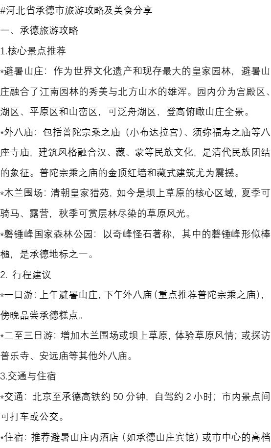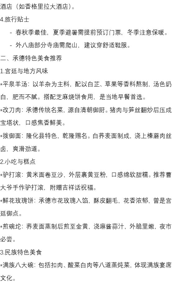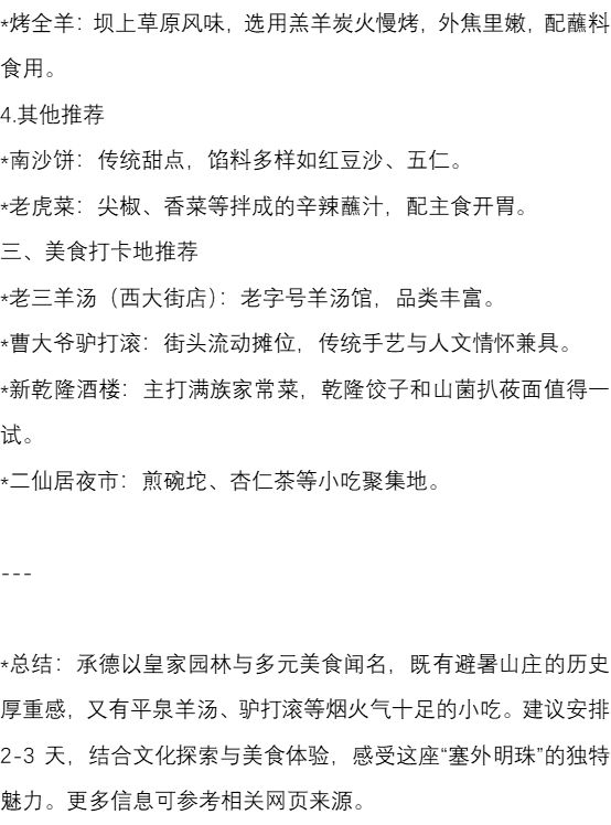 *总结:承德以皇家园林与多元美食闻名,既有避暑山庄的历史厚重感,又有平泉羊汤、驴打滚等烟火气十足的小吃。建议安排2-3天,结合文化探索与美食体验,感受这座“塞外明珠”的独特魅力。更多信息可参考相关网页来源。