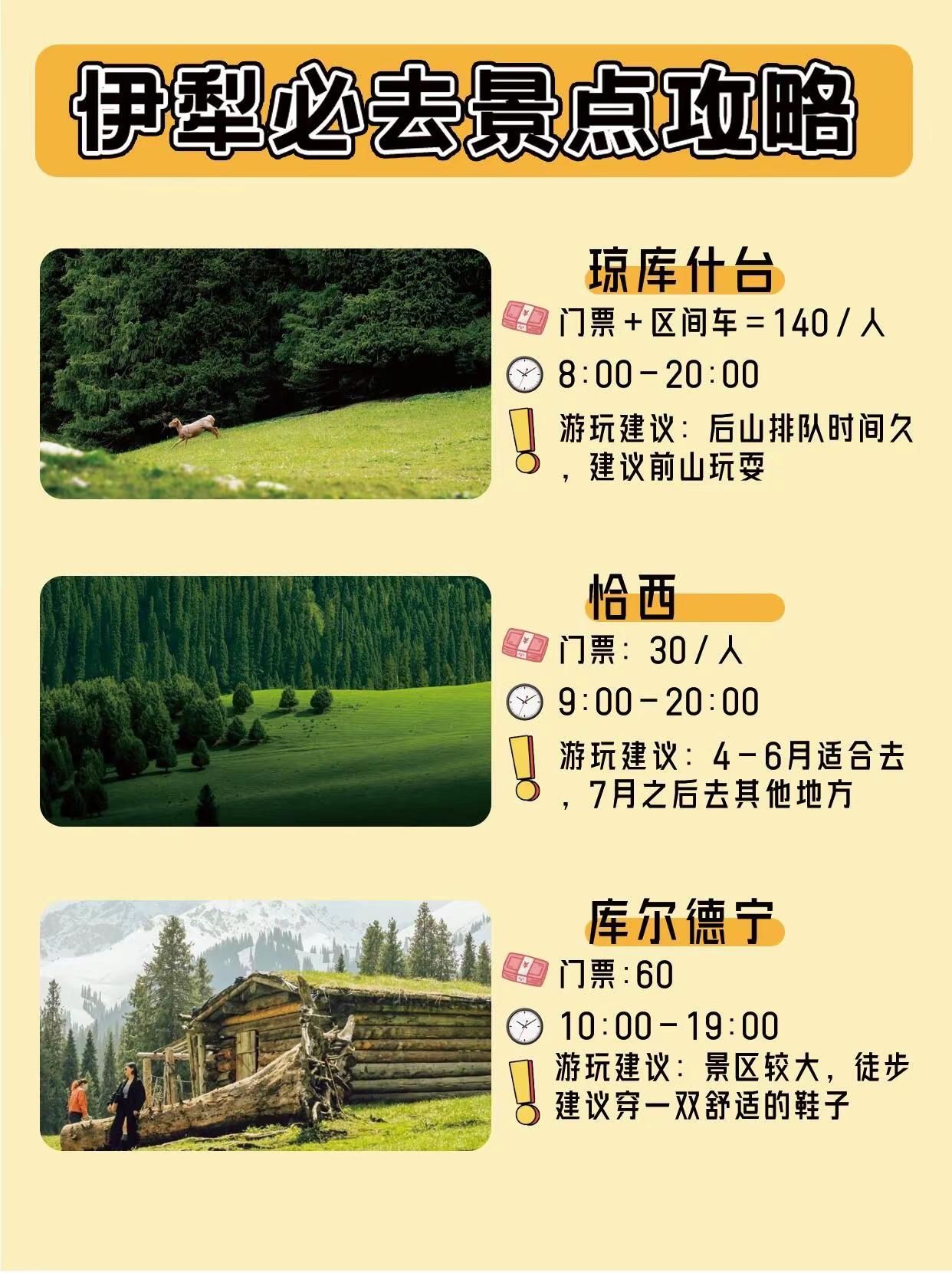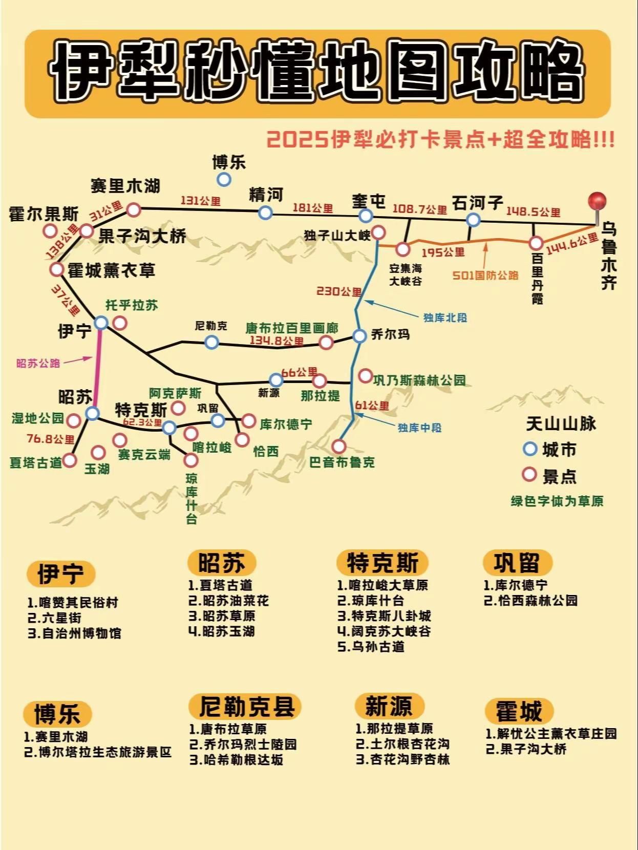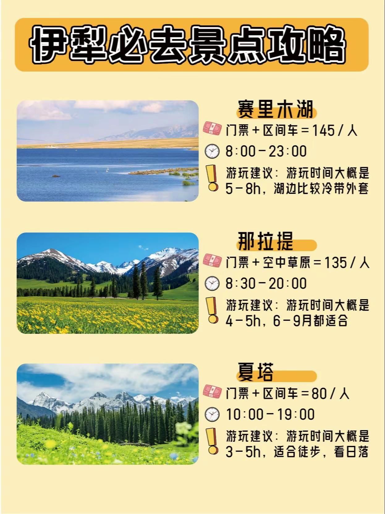 2025伊犁出行秒懂地图。那拉提国家旅游度假区门票:旺季(6.1-9.30)95元/人,淡季(4.1-5.31、10.1-11.30)60元/人;自驾游票200元/人(含门票)区间车:空中草原线40元/人,河谷草原线24元/人,雪莲谷线60元/人开放时间:8:00-19:00伊犁老牌成熟景区,分为空中草原、河谷草原和盘龙谷道三大区域,适合家庭游,可骑马、徒步,体验哈萨克游牧文化.喀拉峻草原门票:草原门票70元/人,阔克苏峡谷门票35元/人区间车:草原区间车70元/人,峡谷区间车40元/人,游船票80元/人开放时间:8:00-20:30以“立体草原”闻名,分东、西两区,东喀拉峻有鲜花台、猎鹰台等精华景点,适合徒步摄影.恰西国家森林公园门票:30元/人区间车:20元/人(常规路线)或40元/人(大库尔德宁至恰西塔里木环线)开放时间:9:00-20:00伊犁绿得最早的草原,4月中旬即可游览,以“恰西画卷”和轻越野自驾路线著称.库尔德宁景区门票:60元/人区间车:48元/人开放时间:10:00-19:00天山雪岭云杉最密集的区域,齐梦德观景台可俯瞰森林与雪山,适合露营避暑琼库什台门票:免费区间车:无,需徒步或骑马(后山路需6小时)开放时间:全天开放小众免费村落,乌孙古道入口,后山有原生态草原与木屋,适合深度徒步.唐布拉景区门票:免费孟克特古道区间车30元/人,自驾车200元/辆开放时间:8:30-19:00以“百里画廊”和仙女湖闻名,雪山、草原、温泉元素丰富,被誉为新疆版“天空之城”. 赛里木湖景区门票:旺季(4-10月)约70元/人,淡季(11-3月)35元/人区间车:75元/人(环湖线)开放时间:全天开放背靠雪山的高原湖泊,5月蓝冰消融,湖水湛蓝,环湖骑行与摄影极佳.特克斯县(八卦城)门票:城区免费,周边景点如喀拉峻需单独购票开放时间:全天开放世界最大八卦布局城市,无红绿灯,可俯瞰全景或探秘周边草原#这份保姆级旅行攻略请查收 #总要去一趟新疆吧 #新疆旅游攻略 #赛里木湖 #伊犁