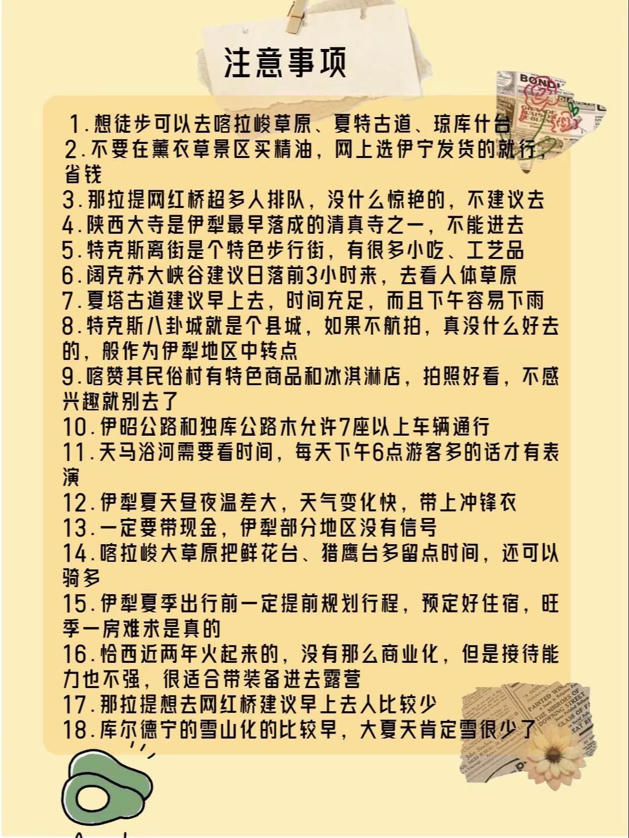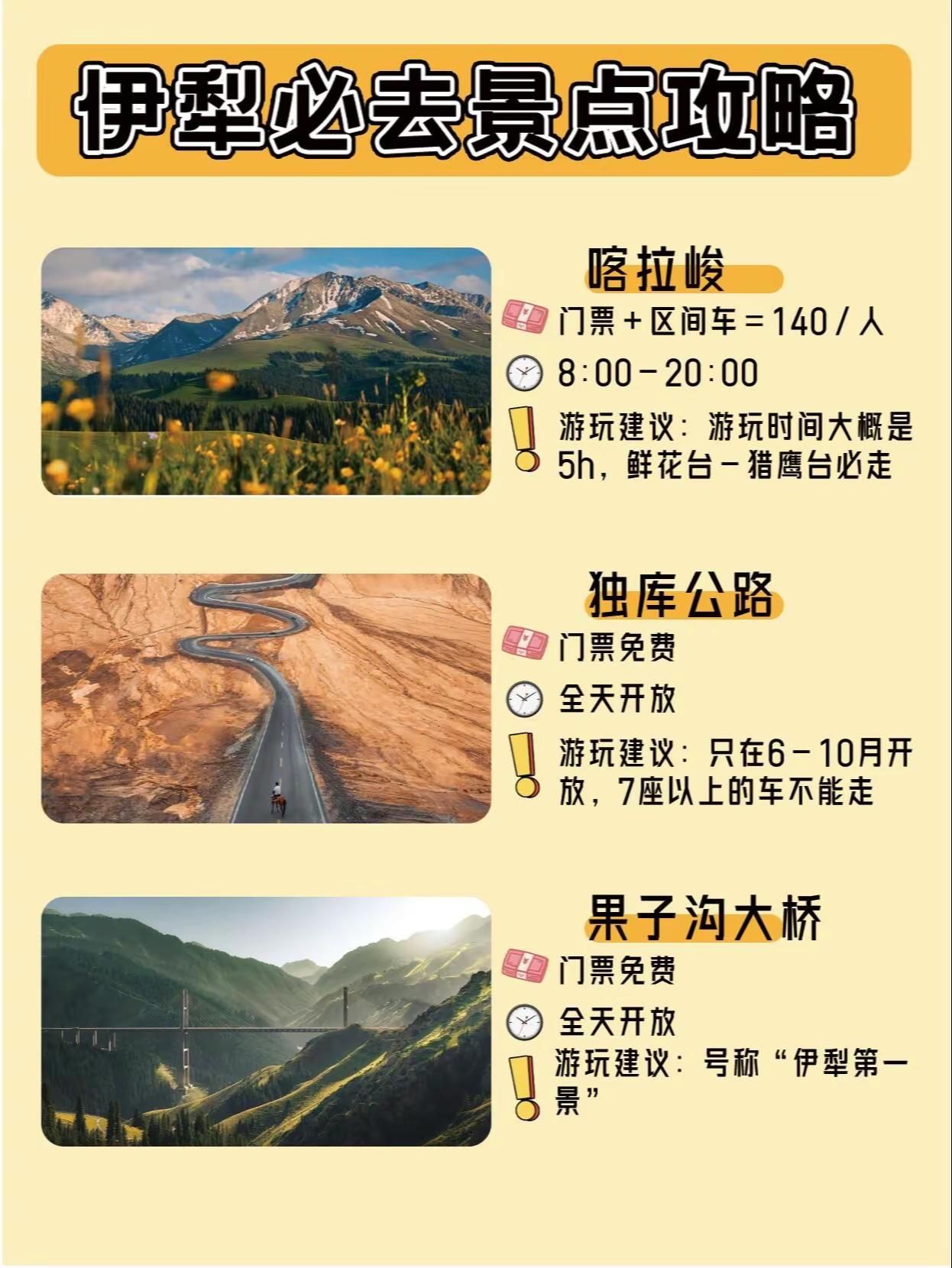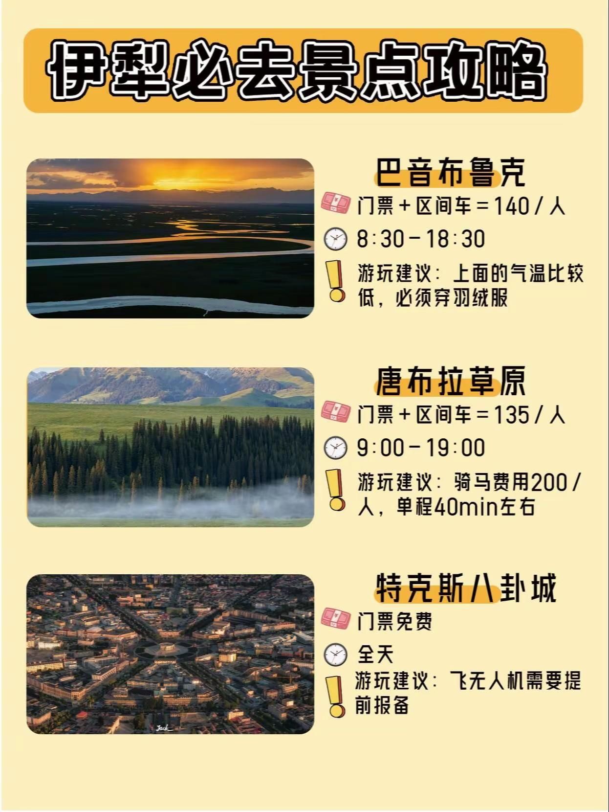 2025伊犁出行秒懂地图。那拉提国家旅游度假区门票:旺季(6.1-9.30)95元/人,淡季(4.1-5.31、10.1-11.30)60元/人;自驾游票200元/人(含门票)区间车:空中草原线40元/人,河谷草原线24元/人,雪莲谷线60元/人开放时间:8:00-19:00伊犁老牌成熟景区,分为空中草原、河谷草原和盘龙谷道三大区域,适合家庭游,可骑马、徒步,体验哈萨克游牧文化.喀拉峻草原门票:草原门票70元/人,阔克苏峡谷门票35元/人区间车:草原区间车70元/人,峡谷区间车40元/人,游船票80元/人开放时间:8:00-20:30以“立体草原”闻名,分东、西两区,东喀拉峻有鲜花台、猎鹰台等精华景点,适合徒步摄影.恰西国家森林公园门票:30元/人区间车:20元/人(常规路线)或40元/人(大库尔德宁至恰西塔里木环线)开放时间:9:00-20:00伊犁绿得最早的草原,4月中旬即可游览,以“恰西画卷”和轻越野自驾路线著称.库尔德宁景区门票:60元/人区间车:48元/人开放时间:10:00-19:00天山雪岭云杉最密集的区域,齐梦德观景台可俯瞰森林与雪山,适合露营避暑琼库什台门票:免费区间车:无,需徒步或骑马(后山路需6小时)开放时间:全天开放小众免费村落,乌孙古道入口,后山有原生态草原与木屋,适合深度徒步.唐布拉景区门票:免费孟克特古道区间车30元/人,自驾车200元/辆开放时间:8:30-19:00以“百里画廊”和仙女湖闻名,雪山、草原、温泉元素丰富,被誉为新疆版“天空之城”. 赛里木湖景区门票:旺季(4-10月)约70元/人,淡季(11-3月)35元/人区间车:75元/人(环湖线)开放时间:全天开放背靠雪山的高原湖泊,5月蓝冰消融,湖水湛蓝,环湖骑行与摄影极佳.特克斯县(八卦城)门票:城区免费,周边景点如喀拉峻需单独购票开放时间:全天开放世界最大八卦布局城市,无红绿灯,可俯瞰全景或探秘周边草原#这份保姆级旅行攻略请查收 #总要去一趟新疆吧 #新疆旅游攻略 #赛里木湖 #伊犁