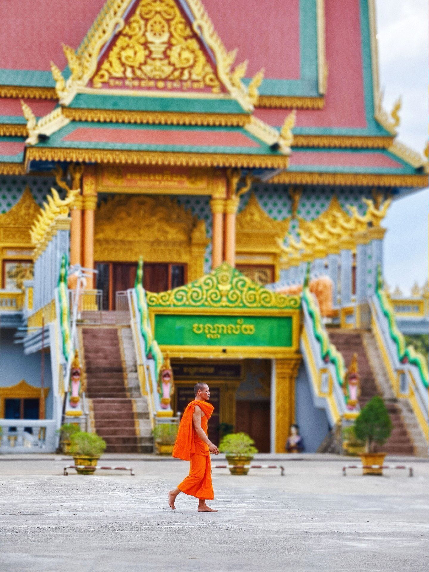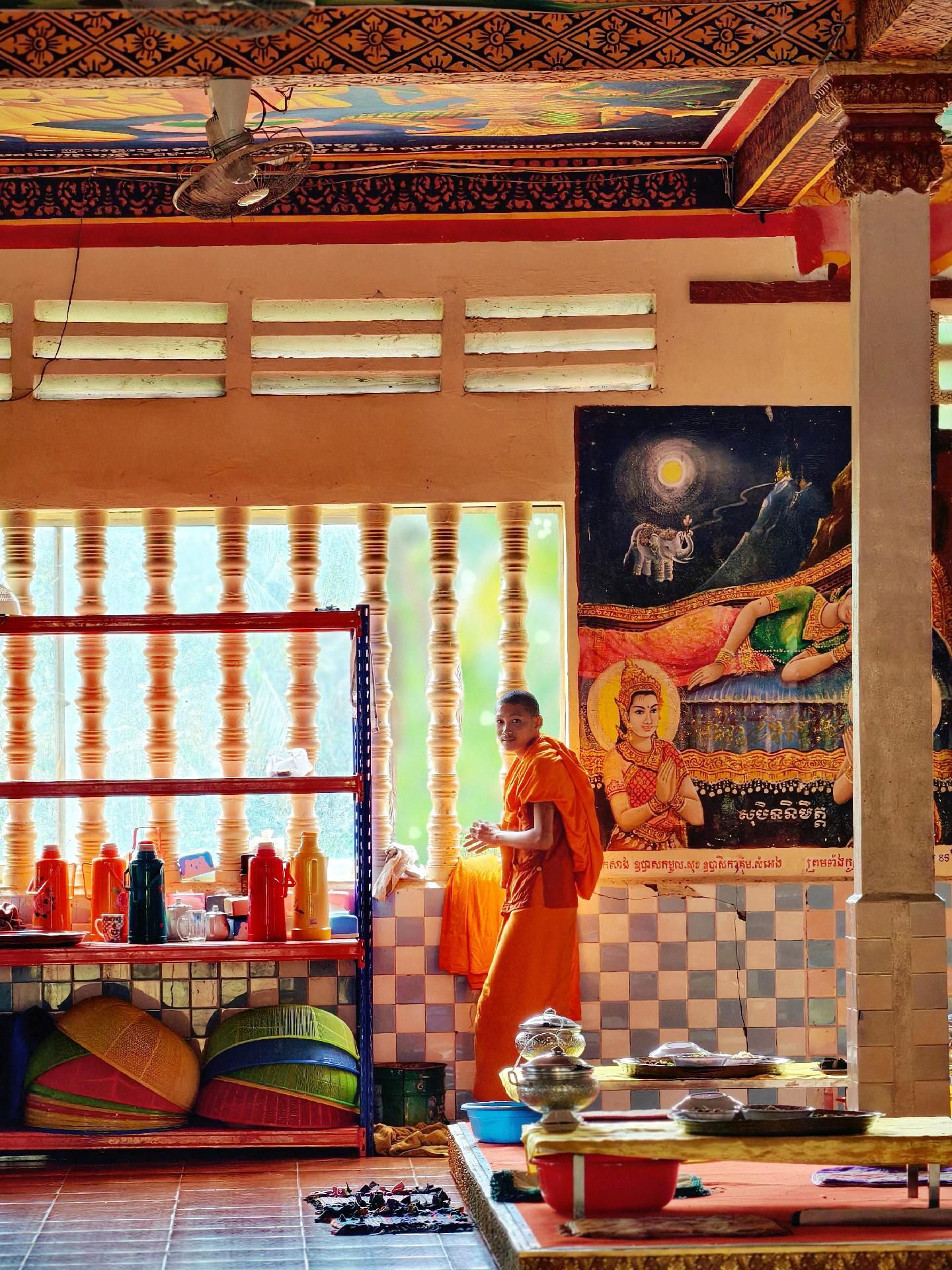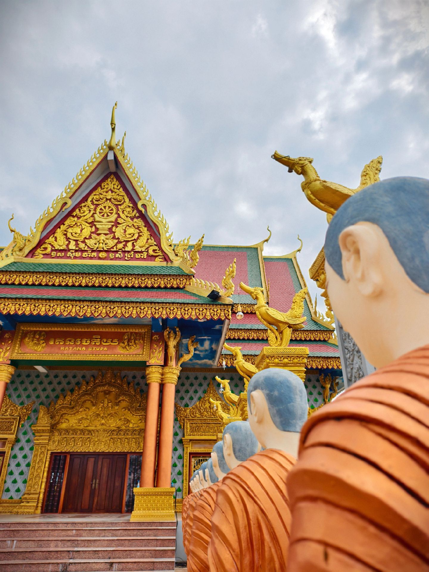 上和尚庙不仅是一个静谧的佛教寺庙,更是俯瞰西哈努克港全景的绝佳位置。站在庙内高台上,整座城市和美丽的海岸线尽收眼底。庙内的高棉风格雕刻精美,色彩斑斓的壁画生动展现了丰富的宗教故事和历史背景,让人流连忘返。在这里还遇到了一群天真烂漫的孩子,笑容纯真,眼中闪烁着光芒。即便是在这片神圣的气氛中,孩子们的笑声依然回荡,给这座庙宇带来了一份活力和温暖。