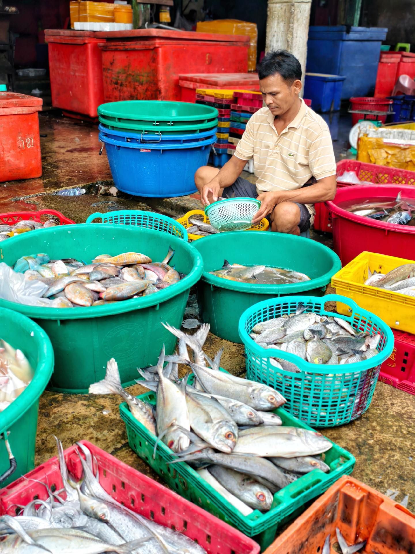西哈努克港的渔港是当地人生活的核心。每天,渔船满载而归,新鲜的海鲜一波接一波地运上岸。港口的木船整齐地停靠在水面上,渔民们正忙着修补渔网,动作迅速而熟练。港口边的小摊上,摆满了各式各样的海鲜:兰花蟹、小鱿鱼、金枪鱼、马鲛鱼,种类繁多,简直是海鲜的天堂。这里的热闹景象,特别适合拍摄富有生活气息的人文照片。