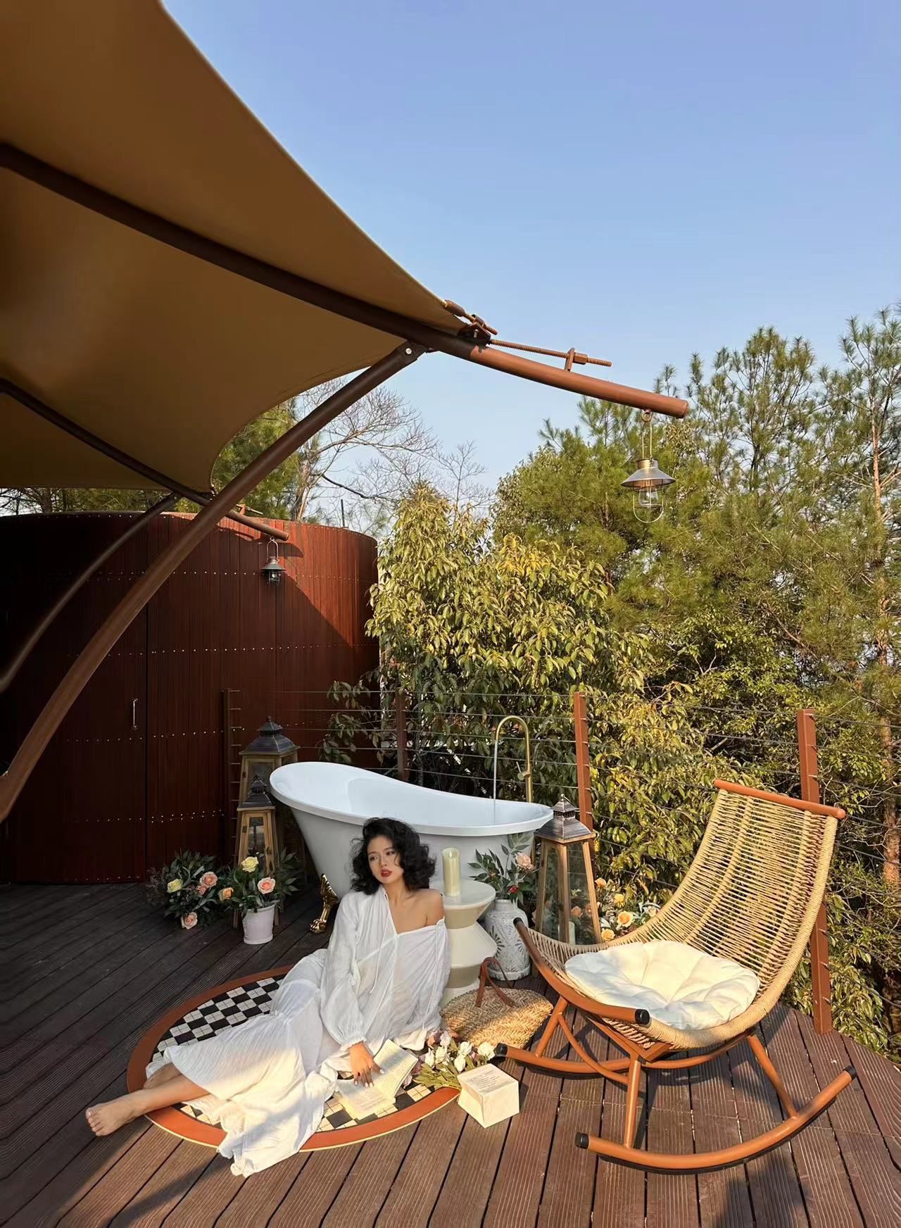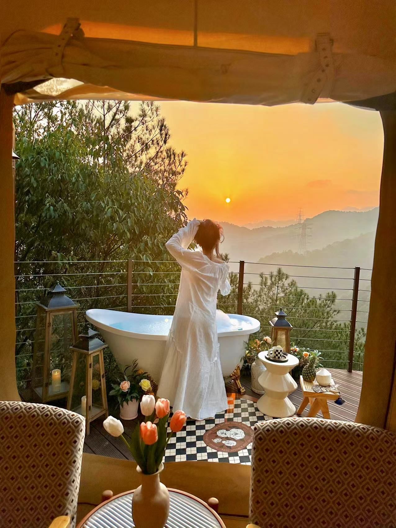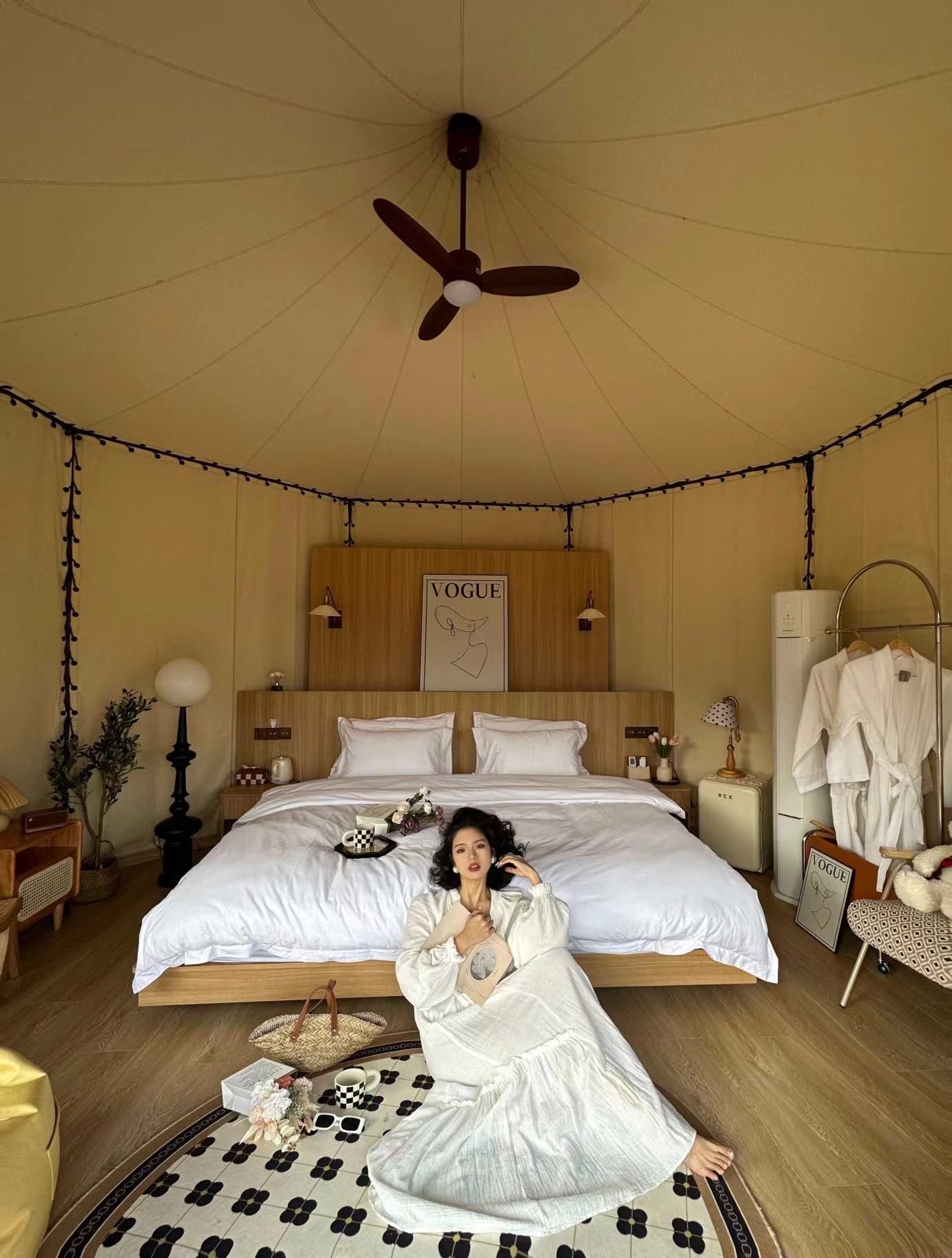 每顶帐篷都是独立设计,配套宽敞卧室、精致浴房,还有全景阳光露台!白天看山峦叠翠,傍晚赏日落霞光,拍照不用滤镜直接出片。帐篷内部装修走轻奢风 ,原木色调搭配现代设施,既能感受自然野趣,又不失舒适感,简直是“精致露营党”的梦中情房。