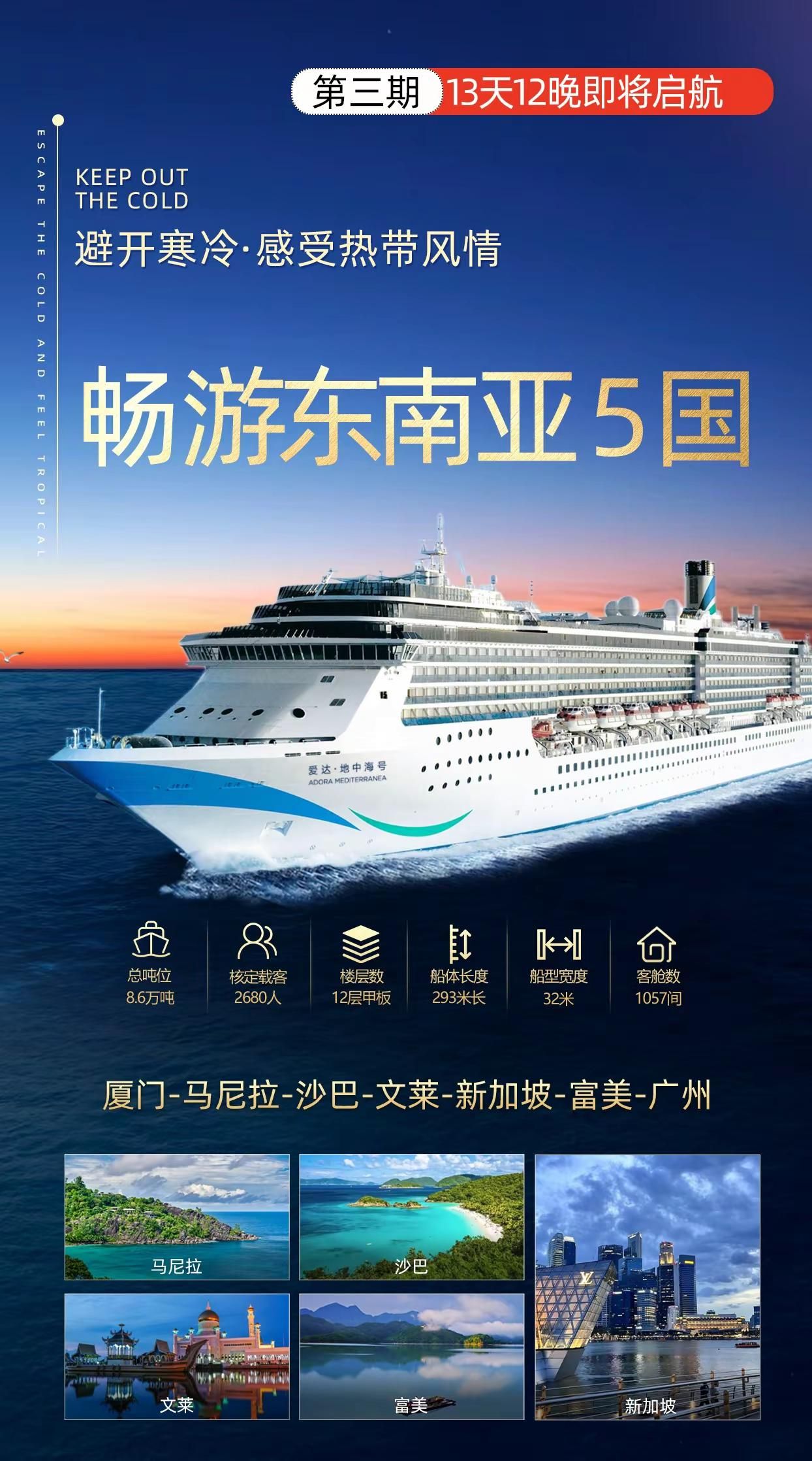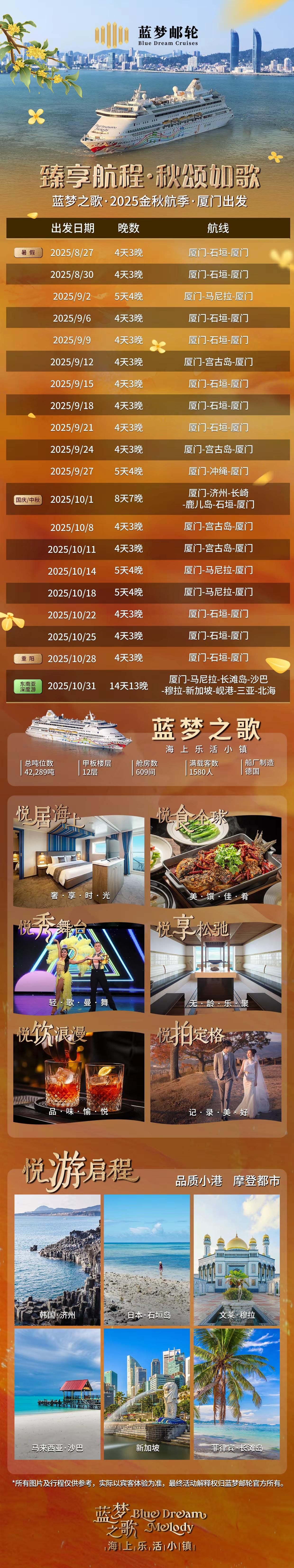 双轮同靠!厦门国际邮轮游正火热! 。4月23日迎来新航站楼启用后的首次双轮同靠“爱达·地中海号”与“蓝梦之歌号”同日作业、并以厦门为母港执航不同航线,再次彰显“海上花园”的风景魅力和产业实力 重点来了!下半年这两艘邮轮将再次从厦门出发承包你的诗与远方 爱达·地中海号特色“海丝”航线11月25日厦门出发12晚13天穿越东南亚5国!菲律宾/马来西亚/文莱/新加坡/越南一路打卡东南亚五国,去年首航就爆火,船票提前数月抢空 蓝梦之歌航线覆盖3-13天18条3-4晚短途航线与2条7-13晚长航线10月1日出发的8天7晚涵盖国庆与中秋双节的“超级黄金周”航线,无需请假且免签即可造访日韩两国四站10月31日出发穿越东南亚菲律宾、马来西亚、文莱、新加坡、越南热带五国的13晚“史诗新视界”航线,将分别带领游客到访东北亚与东南亚两大出境热门旅游圈 下船后玩什么?海上世界:潮汐之眼摩天轮+沉浸式海洋馆+吃喝游购娱一站式体验屿见闽南·时光幻境(5月新开!)全国首个闽南幻境主题景区!以海洋文明、闽南文化、厦门故事为核心,通过建筑、演艺、多元业态、文化空间等,折叠呈现闽南千年时空景象 这个金秋和暖冬,来厦门坐邮轮把东南亚的文化、日韩的大海、闽南的古韵一次性打包进旅行清单吧! 感兴趣的宝子记得来找小邮规划你的邮轮之旅噢~悄悄告诉大家,现在预定还有性价比拉满的优惠,不要错过啦!#来厦门坐邮轮 #厦门国际邮轮中心 #邮轮旅行 #带你去看海 #海上美景