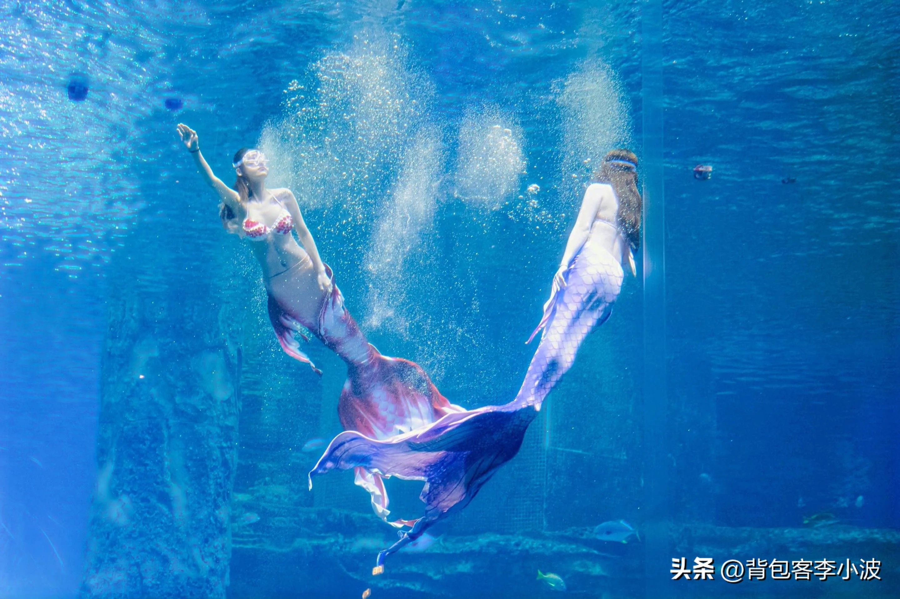 人鱼新手村:在深蓝探秘馆,趁着美人鱼表演时,站在大玻璃前,和美人鱼同框,用低角度拍摄,拍出梦幻的感觉,分分钟出大片。