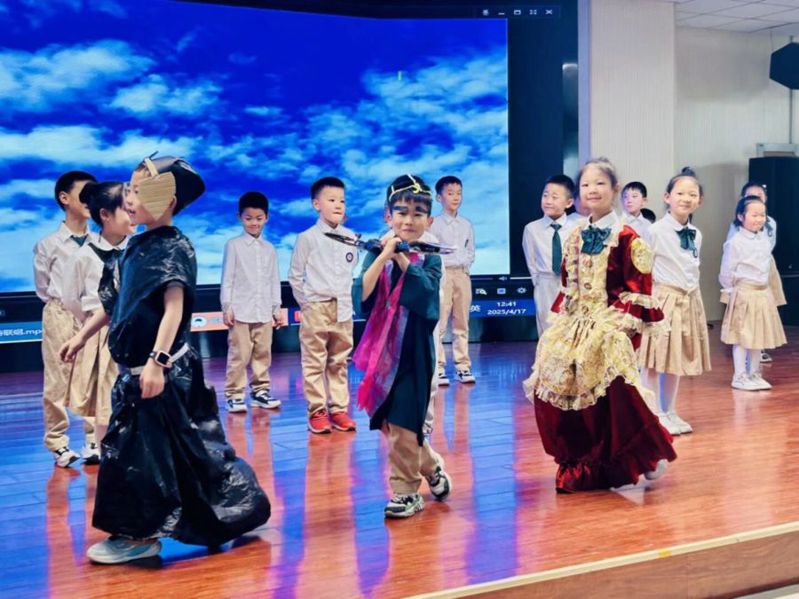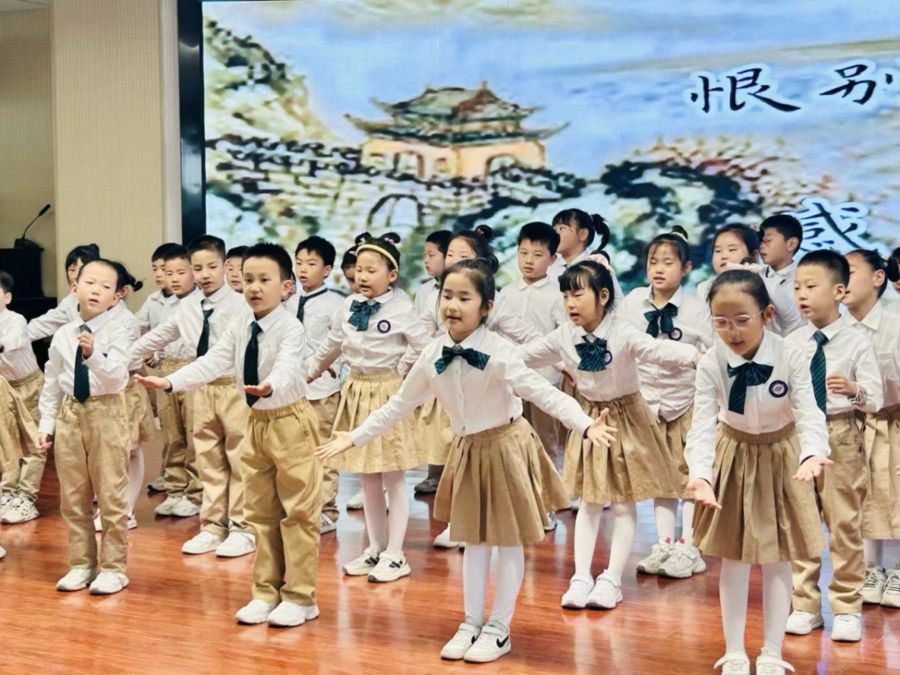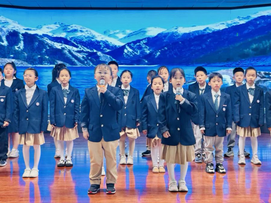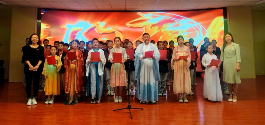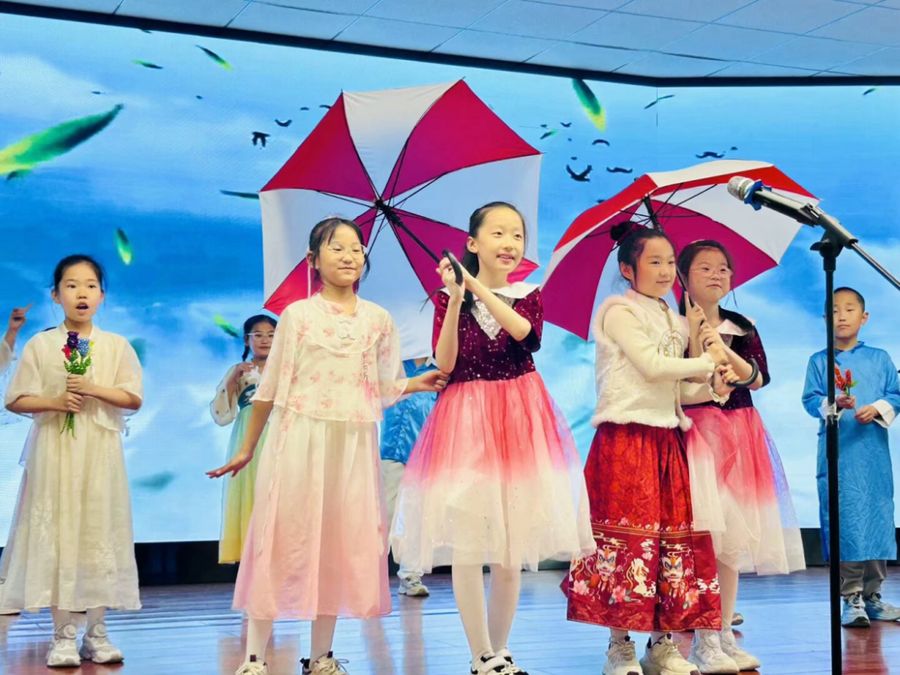 比赛过程中,低年级师生用稚嫩童声演绎《笠翁对韵》《我多想去看看》等,活泼的肢体动作与可爱道具,让经典充满童趣;中年级师生深情诵读《书香少年》《万疆》等,激昂语调尽显对祖国的热爱;高年级师生通过《我的祖国》《读中国》等篇目,展现积极向上的人生态度。