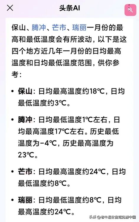 芒市和瑞丽稍好一些,保山和腾冲夜里都要开空调取暖的。特别是早晨,气温很低,只在零度以上,许多人是不适应的。
