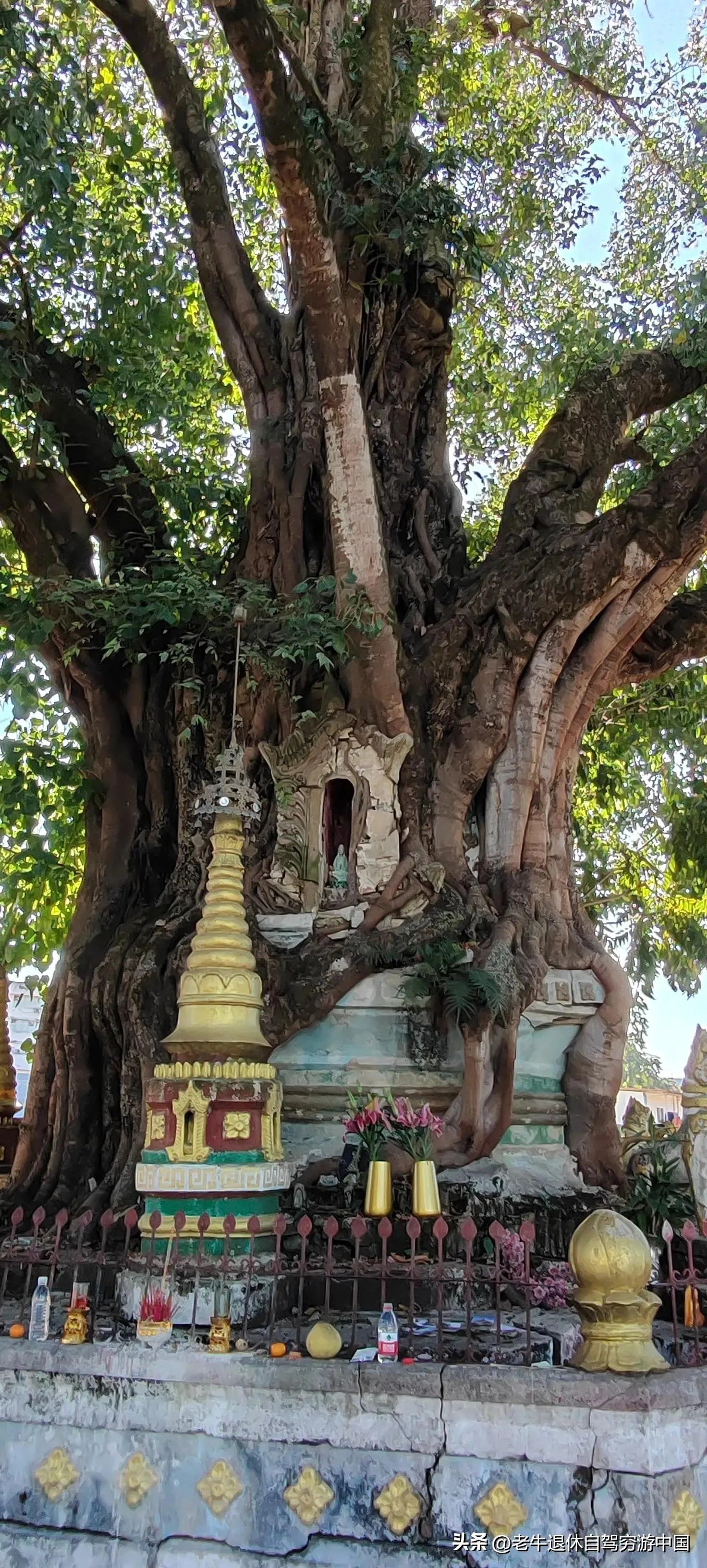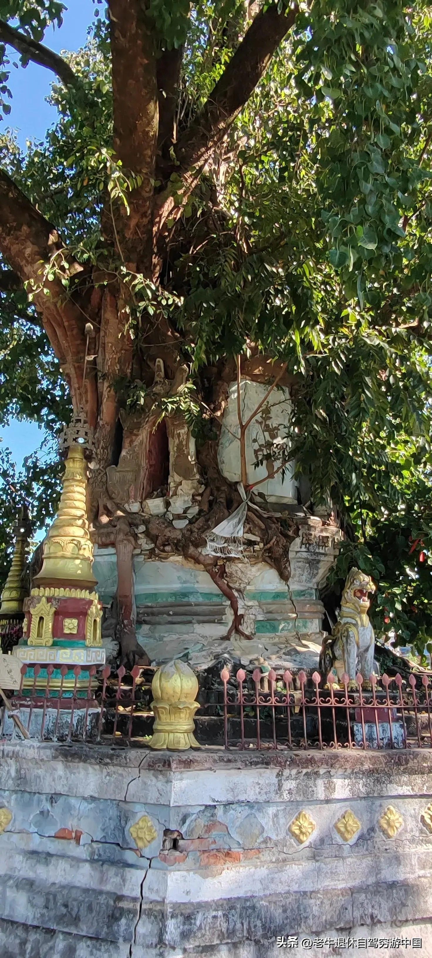 这座古老的佛塔被一棵千年的菩提树紧紧包裹,形成了树中有塔、塔中有树的独特景象,见证了自然与人文的完美融合,也体现了时间的永恒和生命的强大。