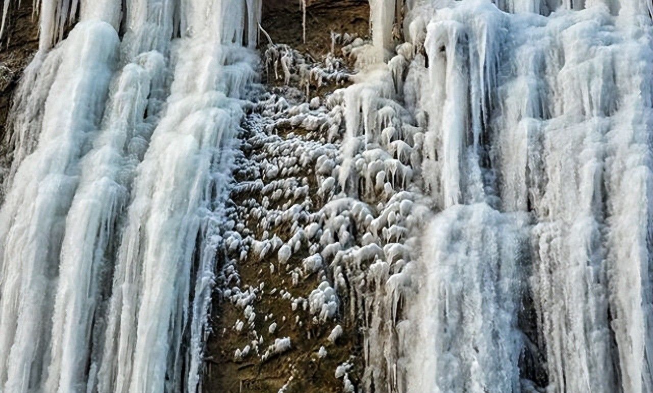 冰瀑布群位于高原气候区,冬季气温在0度以下,溪流凝固在悬崖峭壁上,形成了一道道壮观的冰瀑。 站在冰瀑布边,从上往下看,层层叠叠的冰块,仿佛置身于冰雪龙宫。