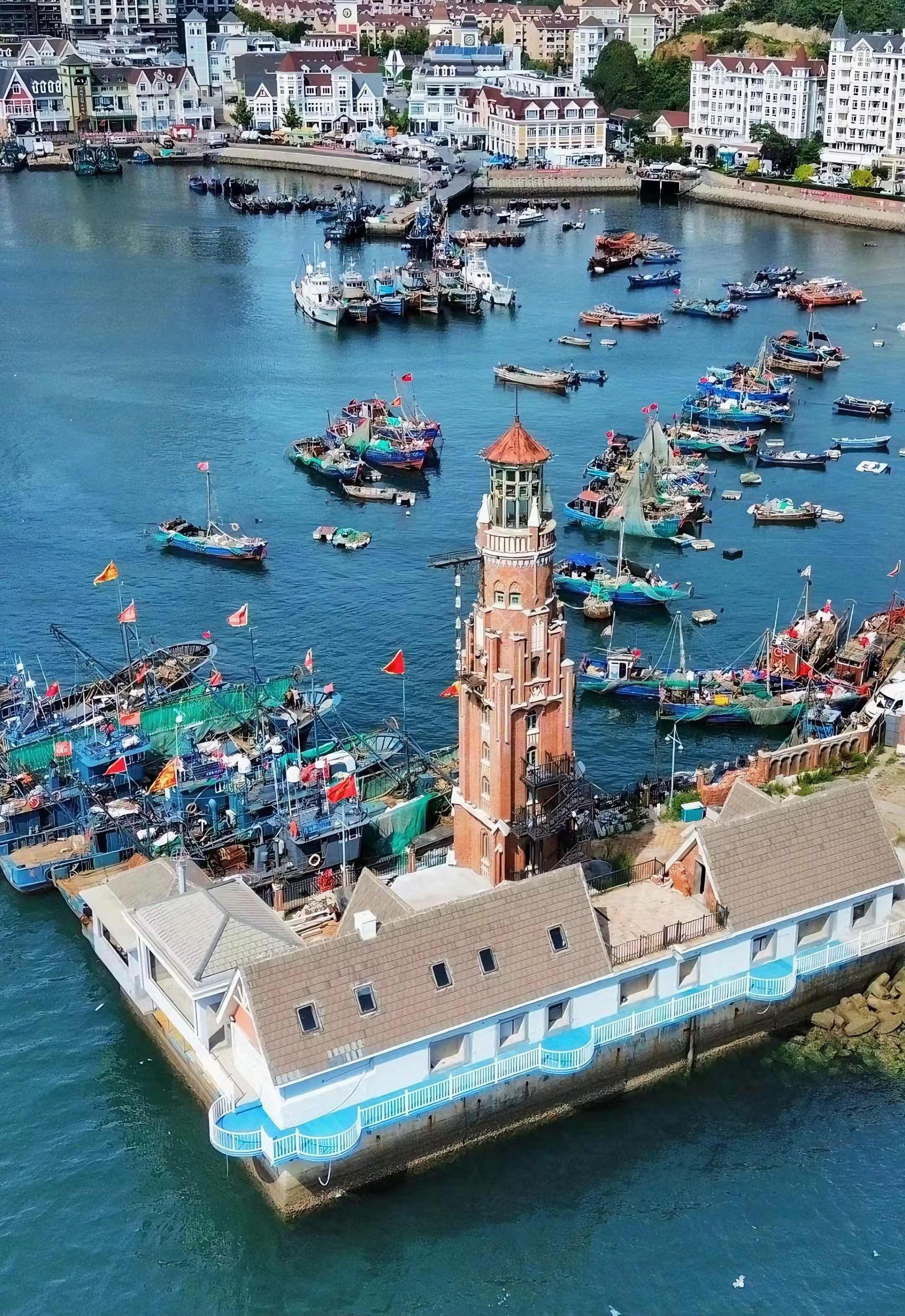 4、渔人码头:临近老虎滩东侧,周边停着大大小小的船只。从菱角湾拍摄对面渔人码头,宛如欧洲的童话小镇,非常文艺。
