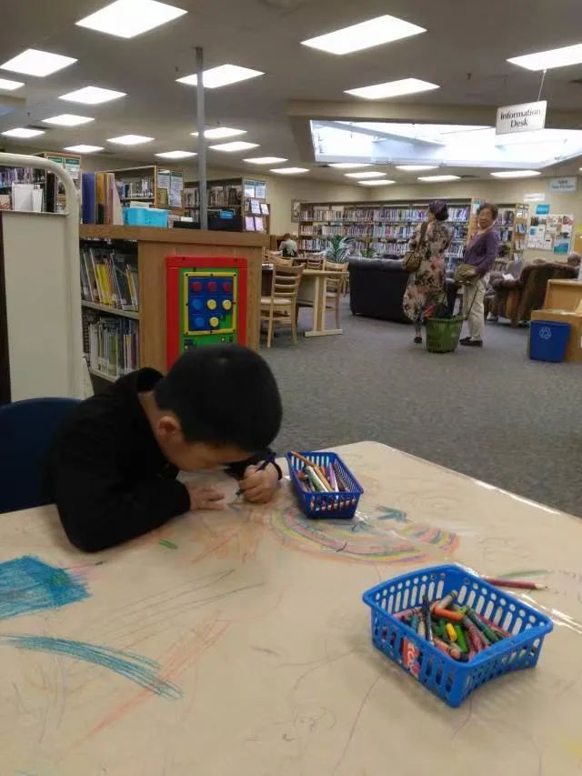 除了老人玩拼图以外,还有儿童学习画画和玩小游戏的地方。有时去,外孙就在画桌上学画画,我们去选购食品。