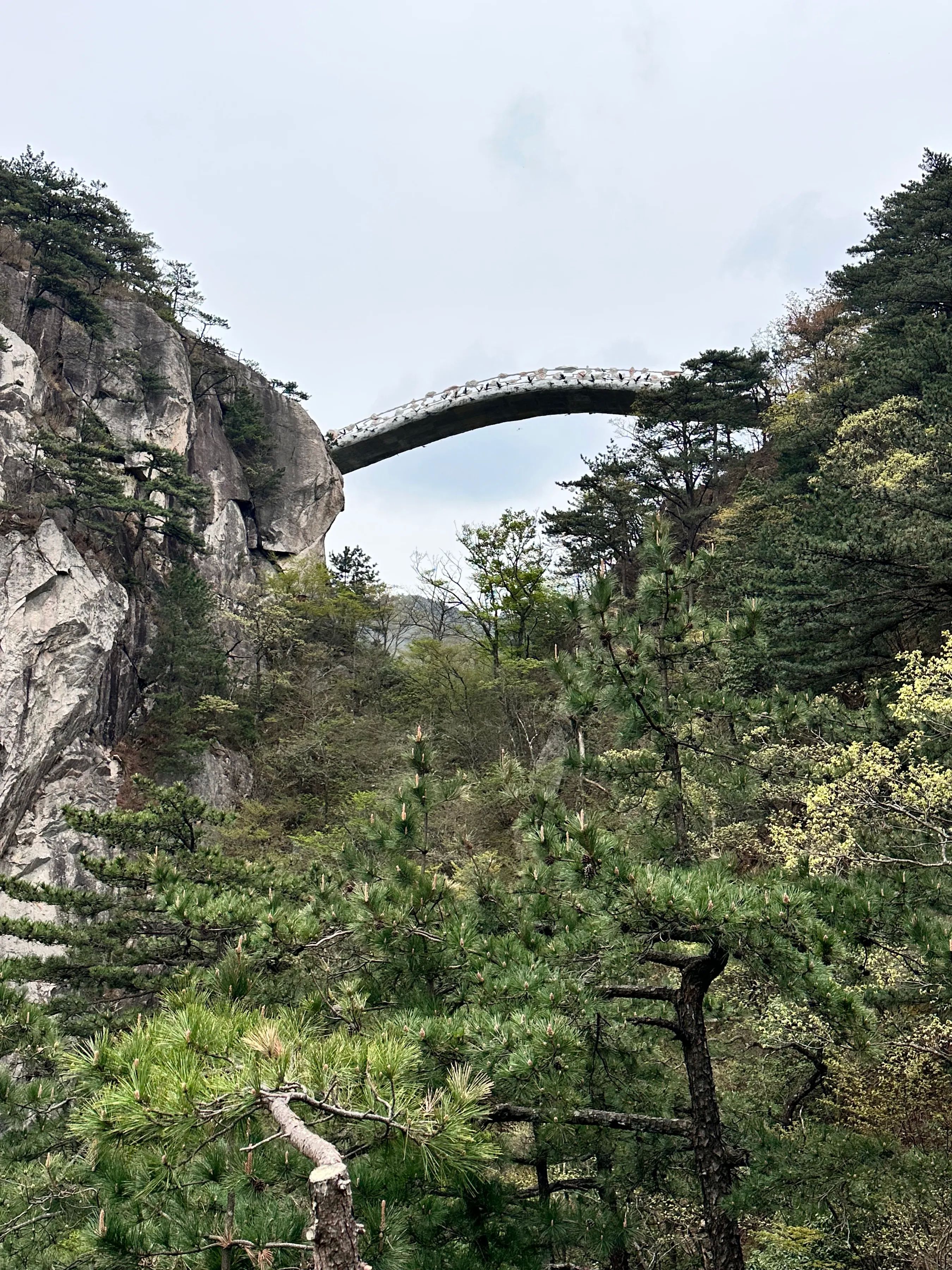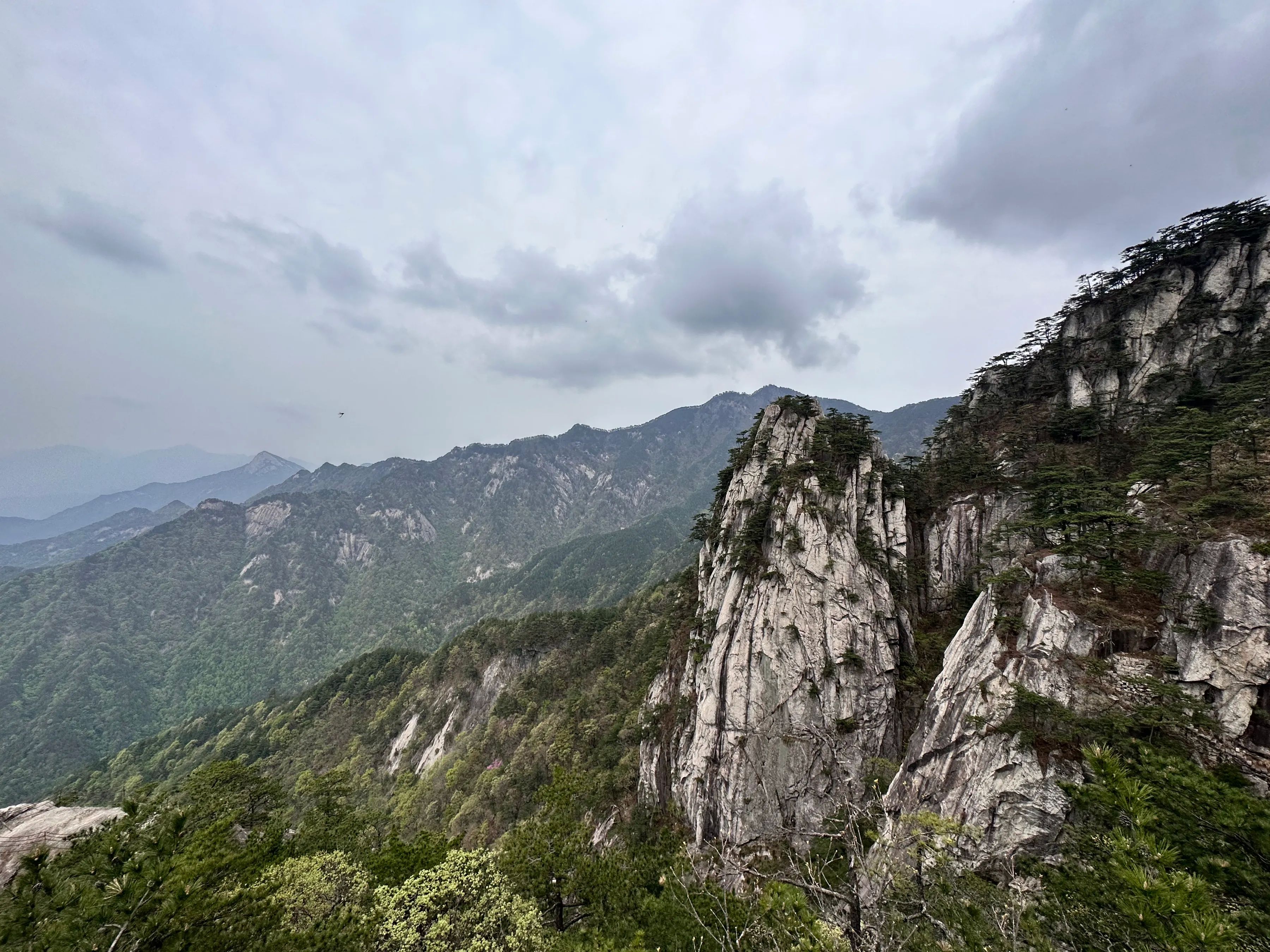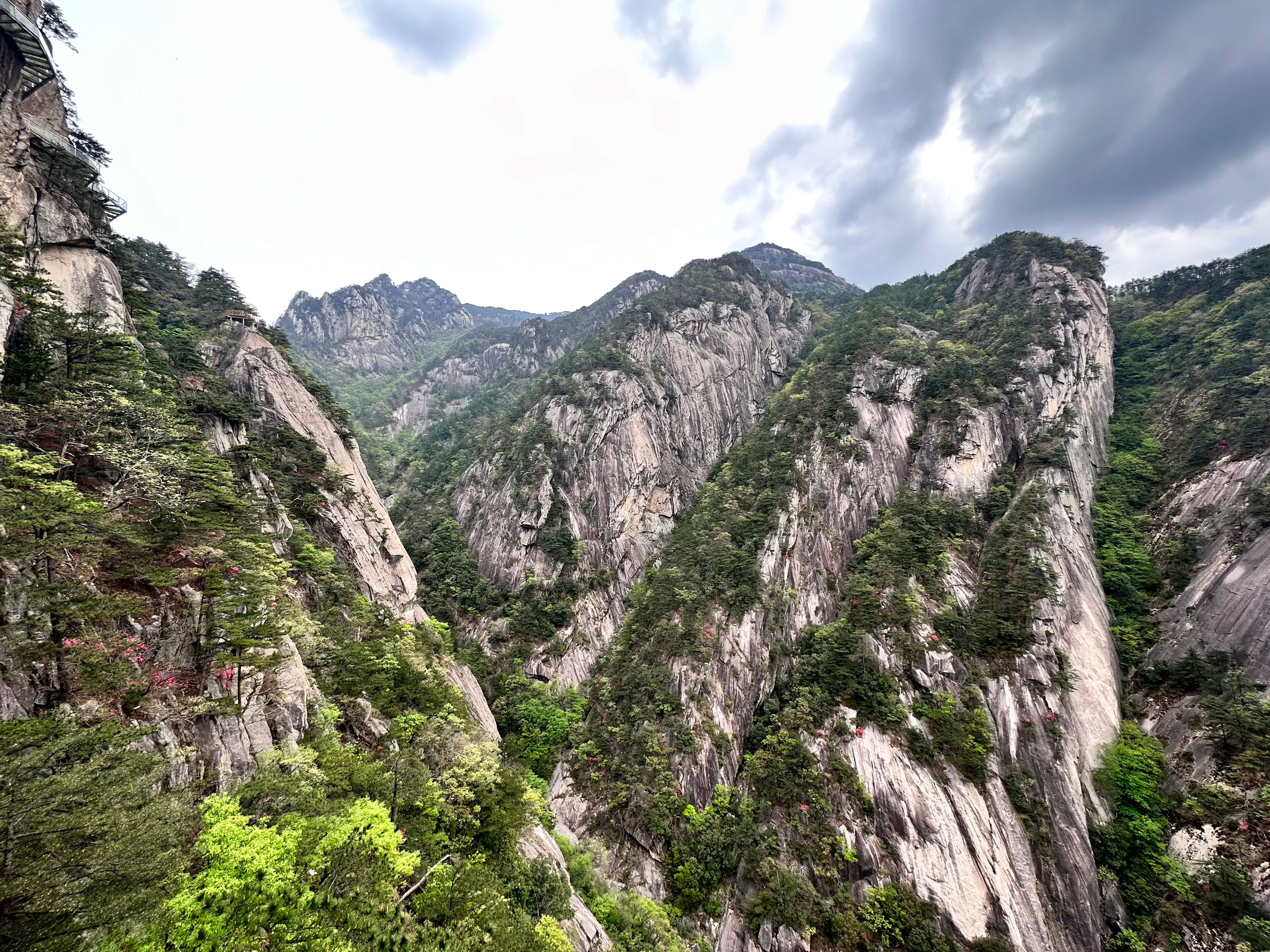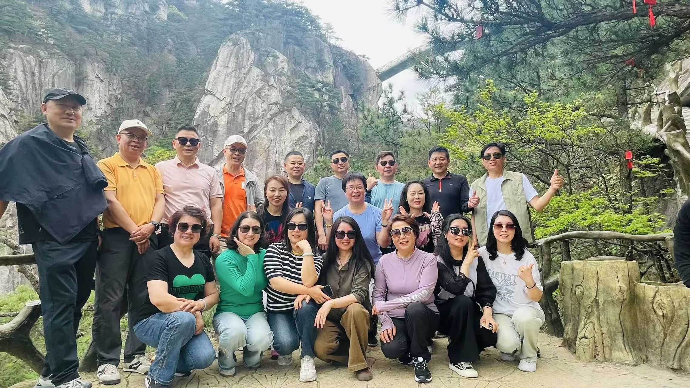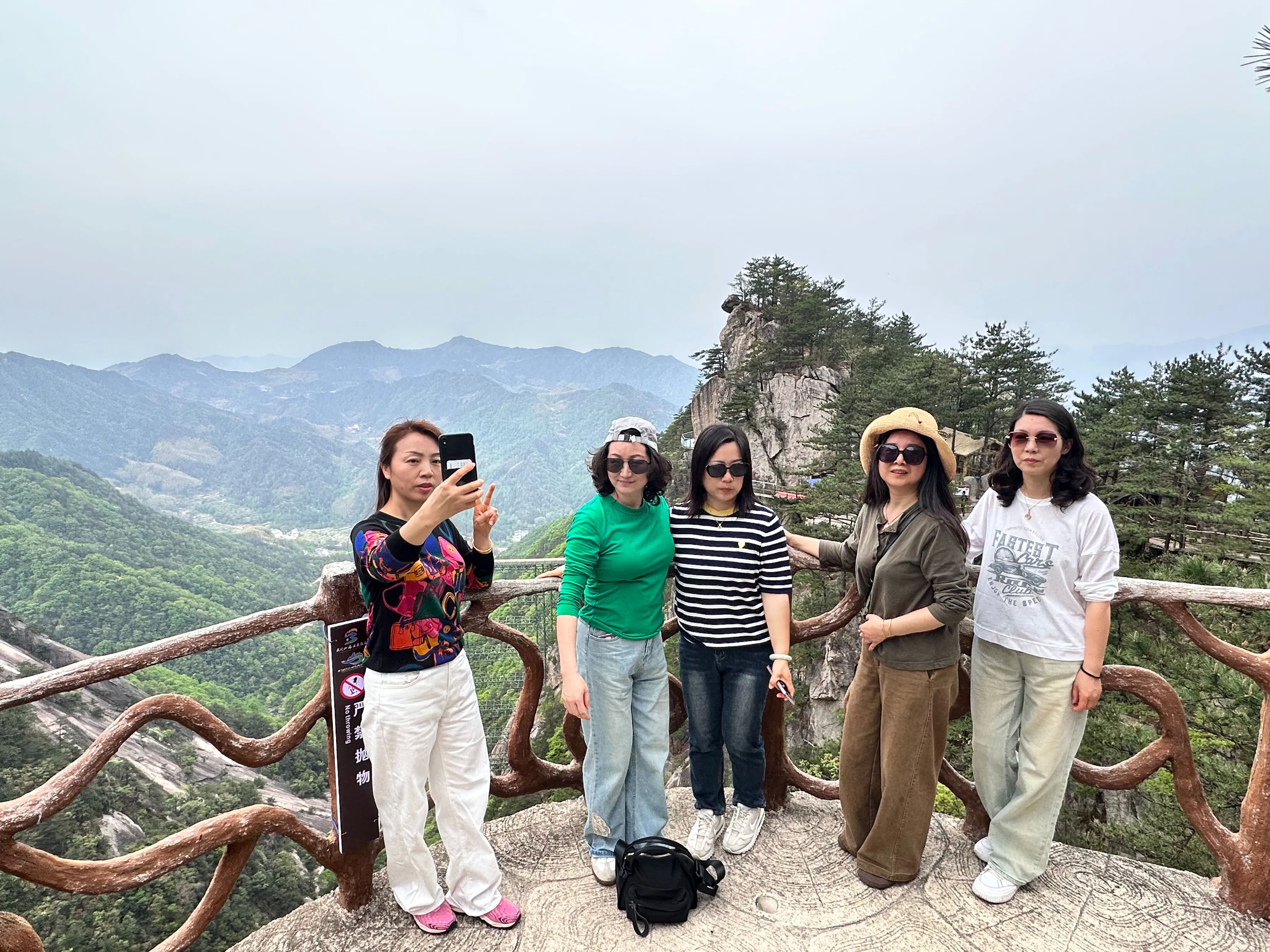 一路上星星点点的杜鹃花点缀在树丛中,虽没有昨天看到的那种满山遍野的视觉冲击,但是那种血渍一丛鲜,重台沓绛笺的感觉也挺有意境,有不一样的观感。这帮朋友有些一直坚持爬山锻练的,有些平时运动强度不是太大,看着高耸入云,海拔1729米的最高峰虽然心里发怵可腿上个个发力,经过不懈的努力克服了有70度以上的陡坡台阶,到了鹊桥,个个都是好汉[强][强][强]。此地离主峰还有300米左右的高度,也是观赏风景最佳的位置,因为时间关系,也为了明天还有充沛的体力去登龟峰山,大家决定稍事休息,用自带干粮补充一下体力后返程,晚上住麻城城区。