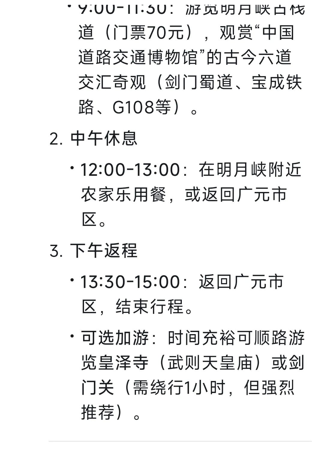 - **9:00-11:30**:游览明月峡古栈道(门票70元),观赏“中国道路交通博物馆”的古今六道交汇奇观(剑门蜀道、宝成铁路、G108等)。