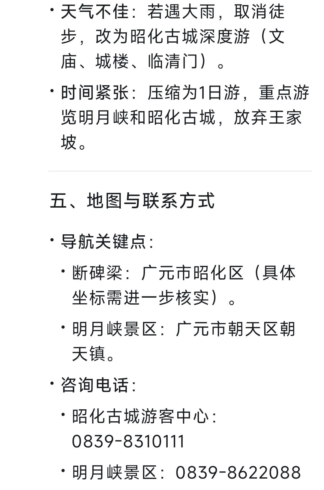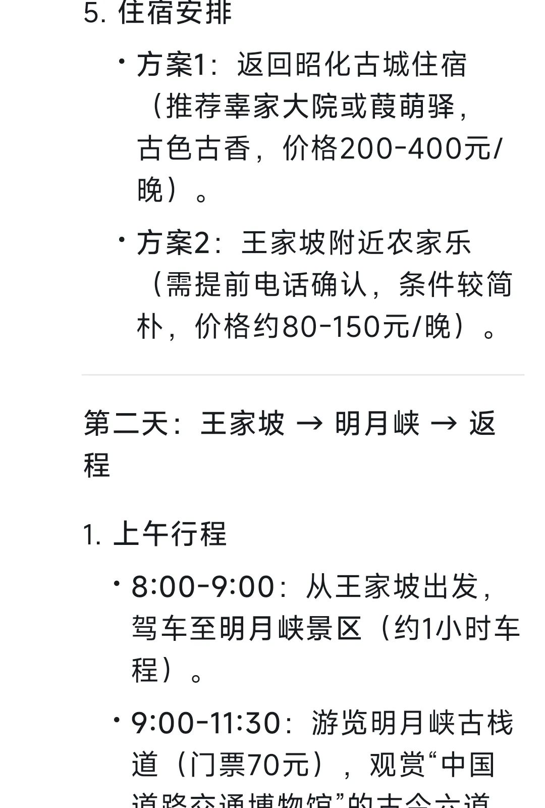 - **时间紧张**:压缩为1日游,重点游览明月峡和昭化古城,放弃王家坡。