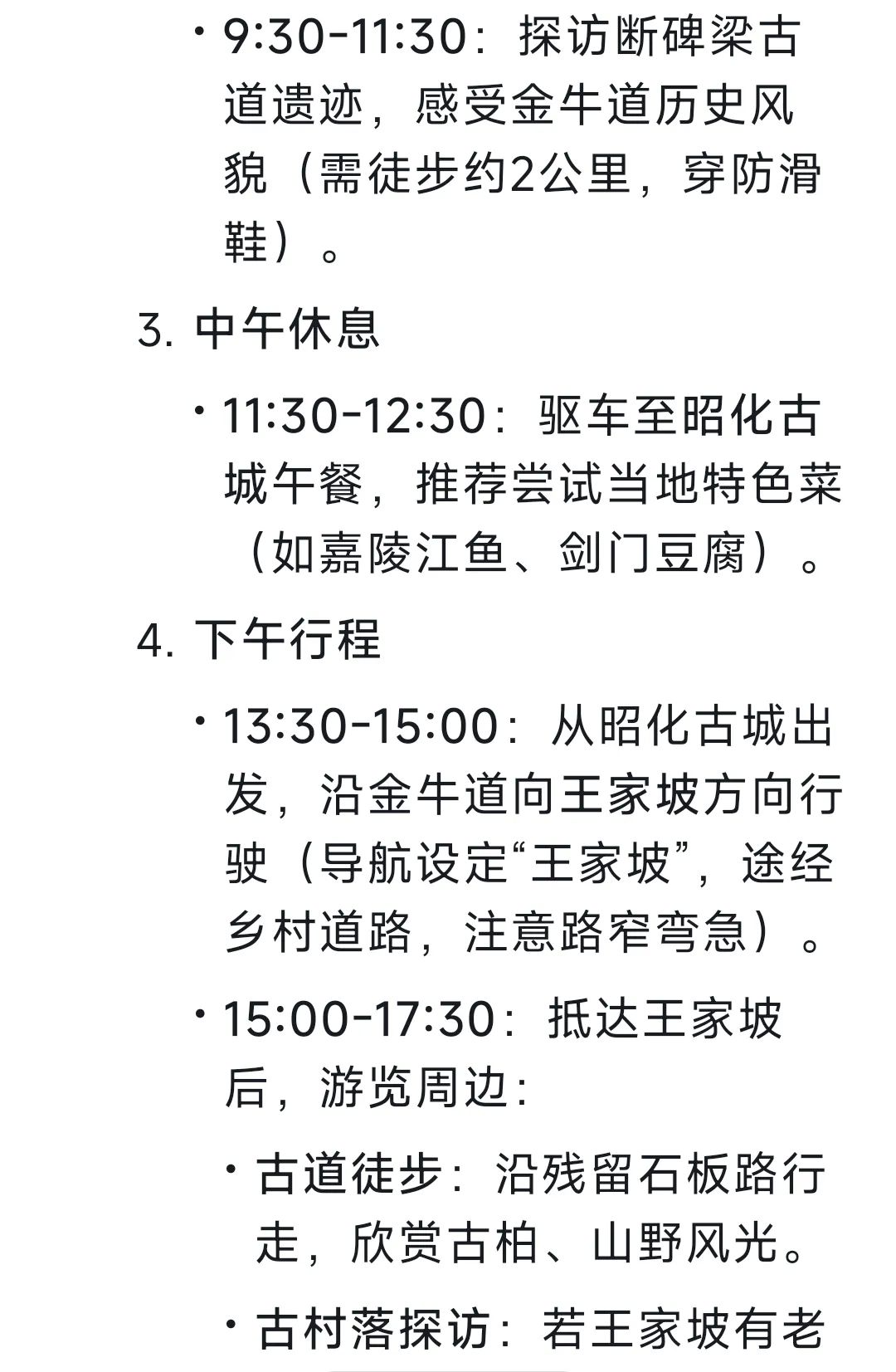 以下是针对四川广元金牛道沿线从断碑梁到王家坡的详细行程规划,结合广元地区实际交通、景点及住宿情况,供参考: