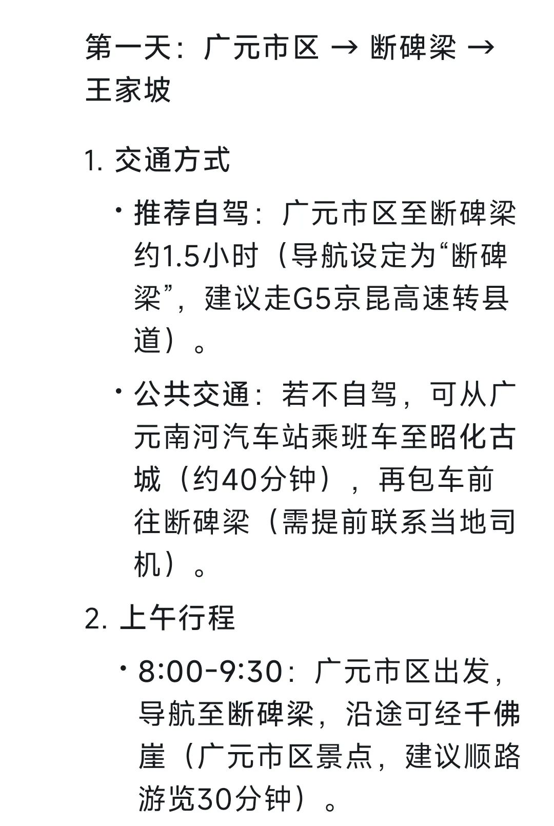 - **8:00-9:30**:广元市区出发,导航至**断碑梁**,沿途可经**千佛崖**(广元市区景点,建议顺路游览30分钟)。