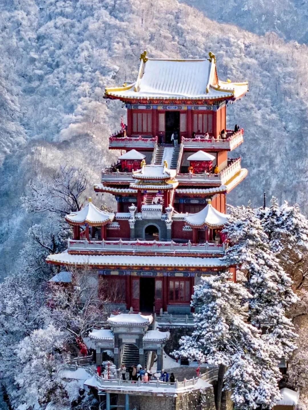 一到冬天,西安人就格外期待唐代诗人祖咏在《终南望馀雪》中描绘的这幅终南雪景,大雪让南五台美成水墨丹青!云雾缭绕,如梦如幻,浮云和雾凇,金顶与红墙在北国雪景中融为一体绝美无比。