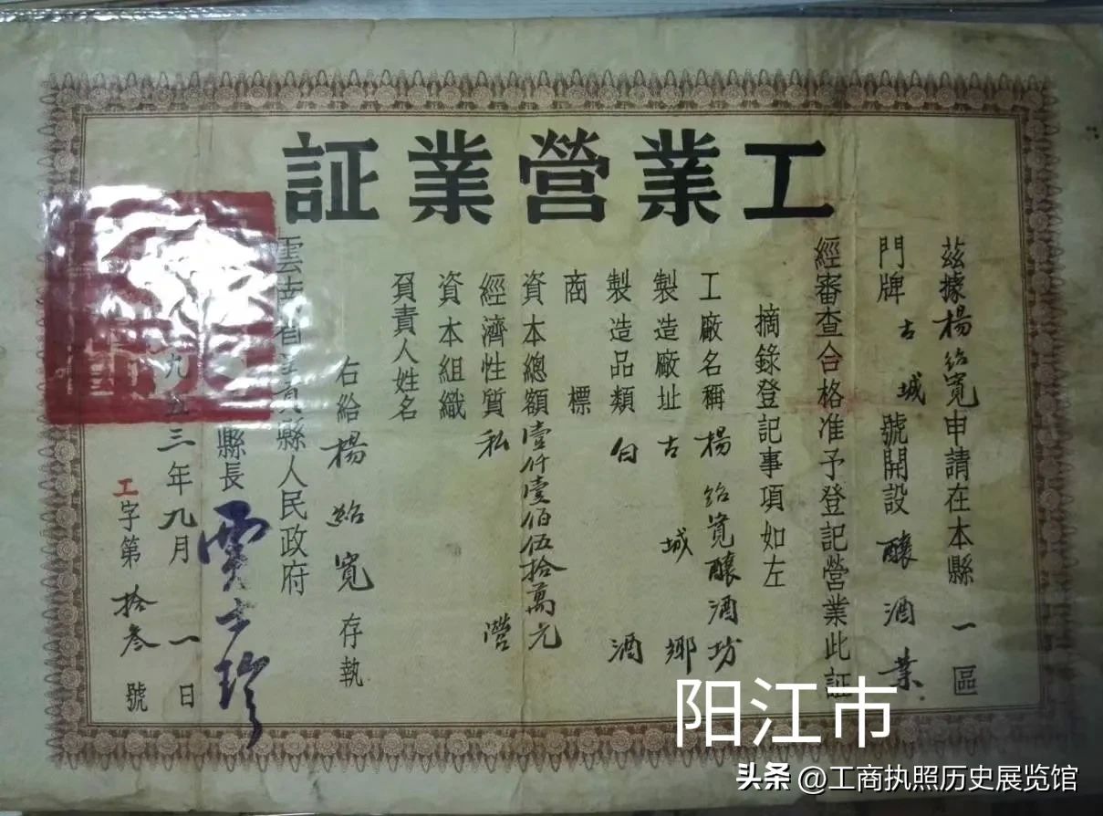 一张老营业执照显示,1953年9月1日由云南省呈贡县人民政府签发的《工业营业证》,工厂名称:杨绍宽酿酒坊,经营地址是古城乡。据考究杨家祖上在明朝时期,呈贡石龙寺的附近,是一个名叫杨百万的大户人家。这户人家以其醇厚的家风而闻名于世。杨百万不仅家财万贯,更是个性情中人,喜欢结交各路朋友,吟诗作对,把酒言欢。他家的豪气,令人陶醉,一时间名扬四海。
