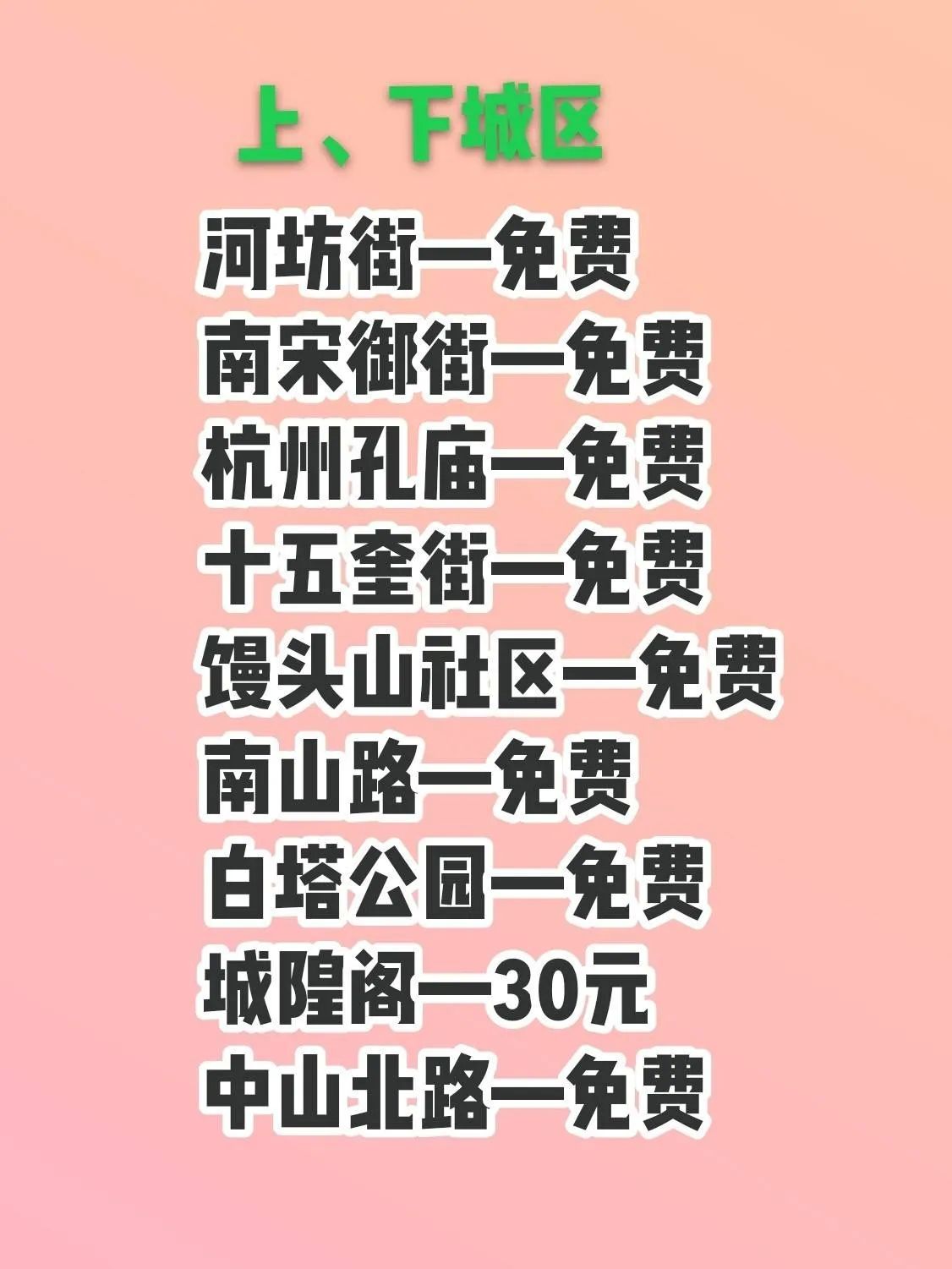 河坊街与南宋御街古色古香,能品尝地道杭帮美食,感受南宋风情。杭州孔庙传承儒家文化。十五奎街晚上的望仙阁在灯光下格外迷人。馒头山社区文艺清新,南山路风景优美。白塔公园可体验复古火车。城隍阁能俯瞰城市风光。中山北路有许多特色小店。
