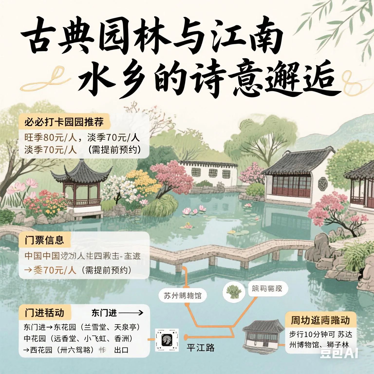 总结:苏州以园林为魂,水乡为韵。建议安排3-4天,兼顾经典园林与小众体验(如艺圃、环秀山庄),搭配一碗苏式汤面和夜游运河,方能品尽江南之美。