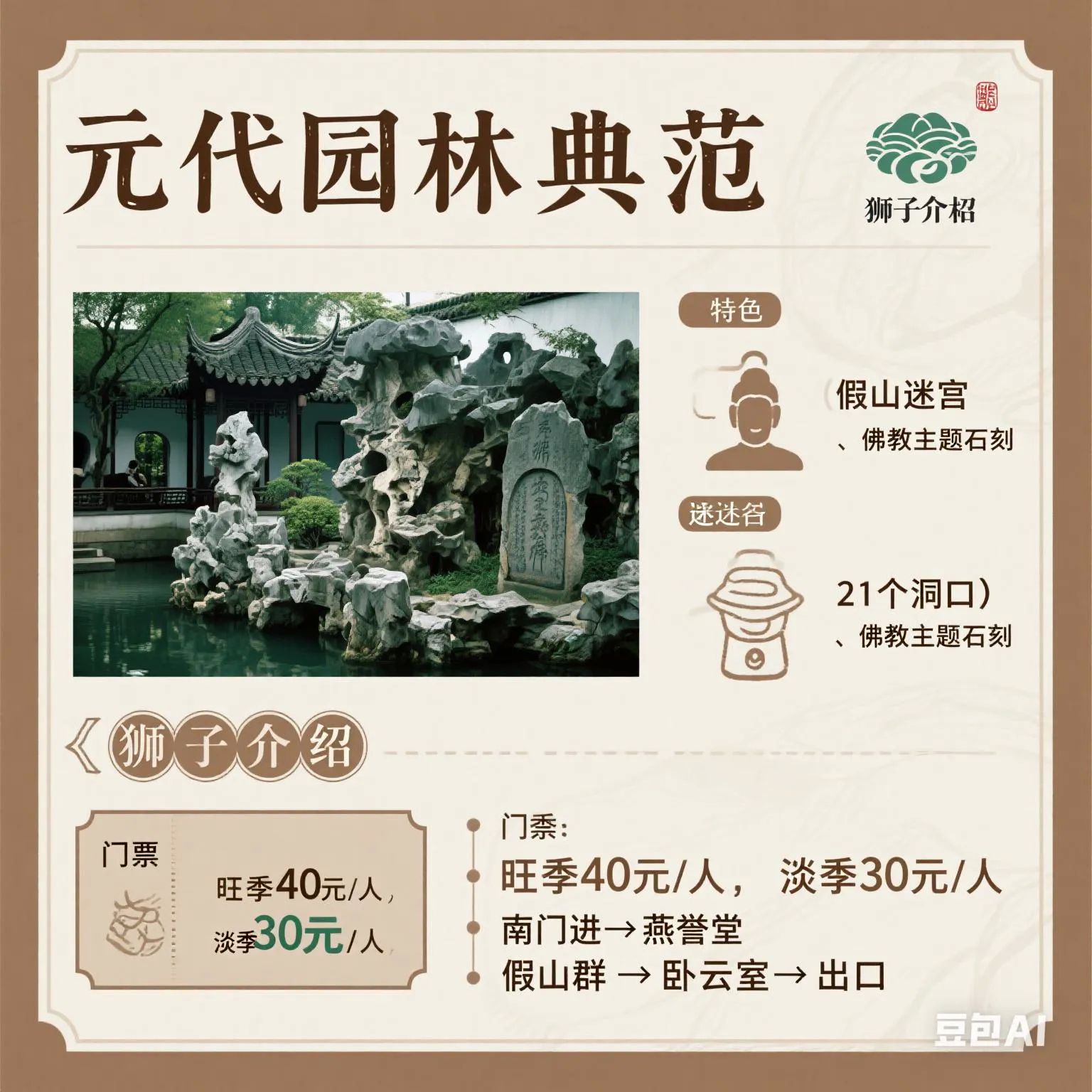 - 特色:假山迷宫(21个洞口)、佛教主题石刻。