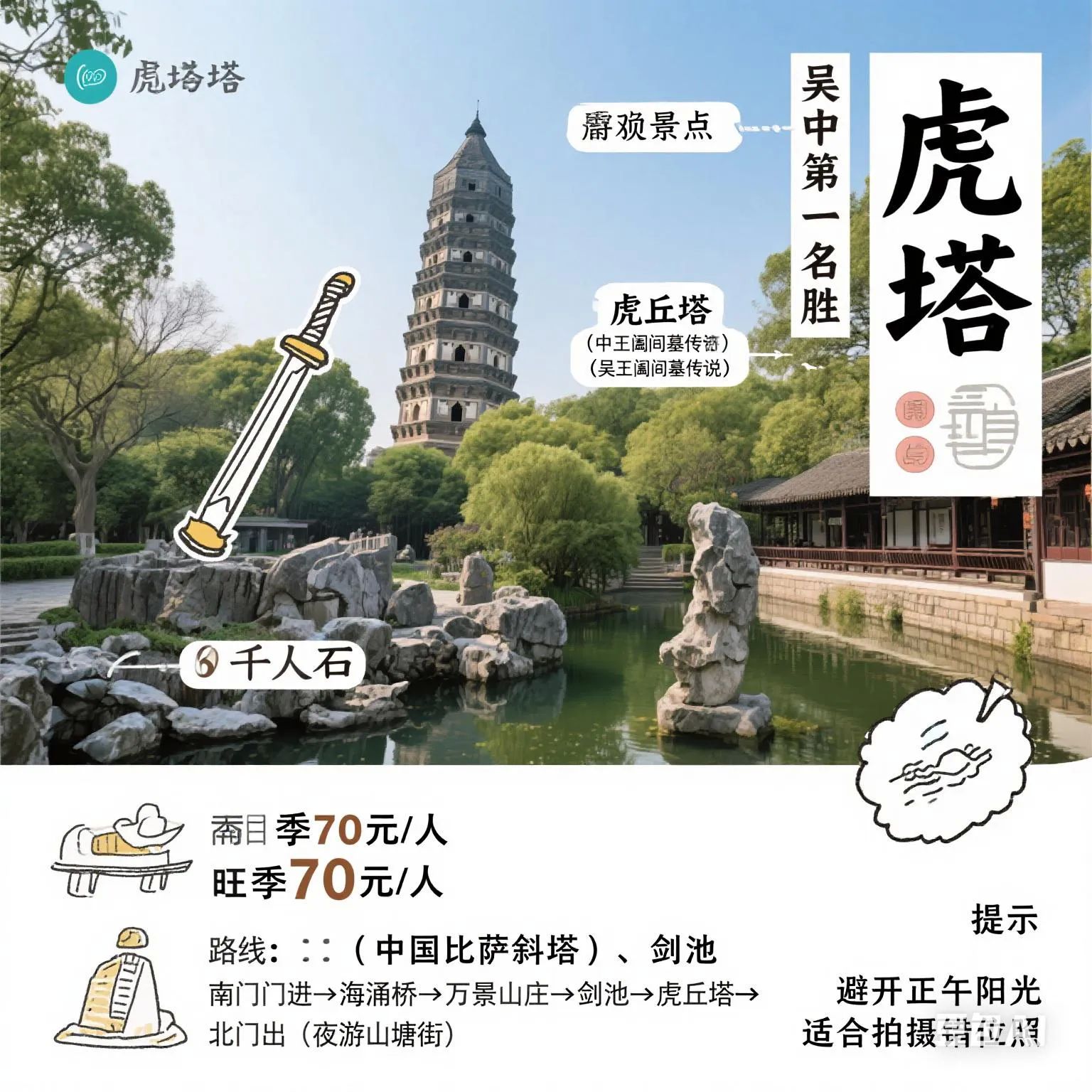 - 必看:虎丘塔(中国比萨斜塔)、剑池(吴王阖闾墓传说)、千人石。